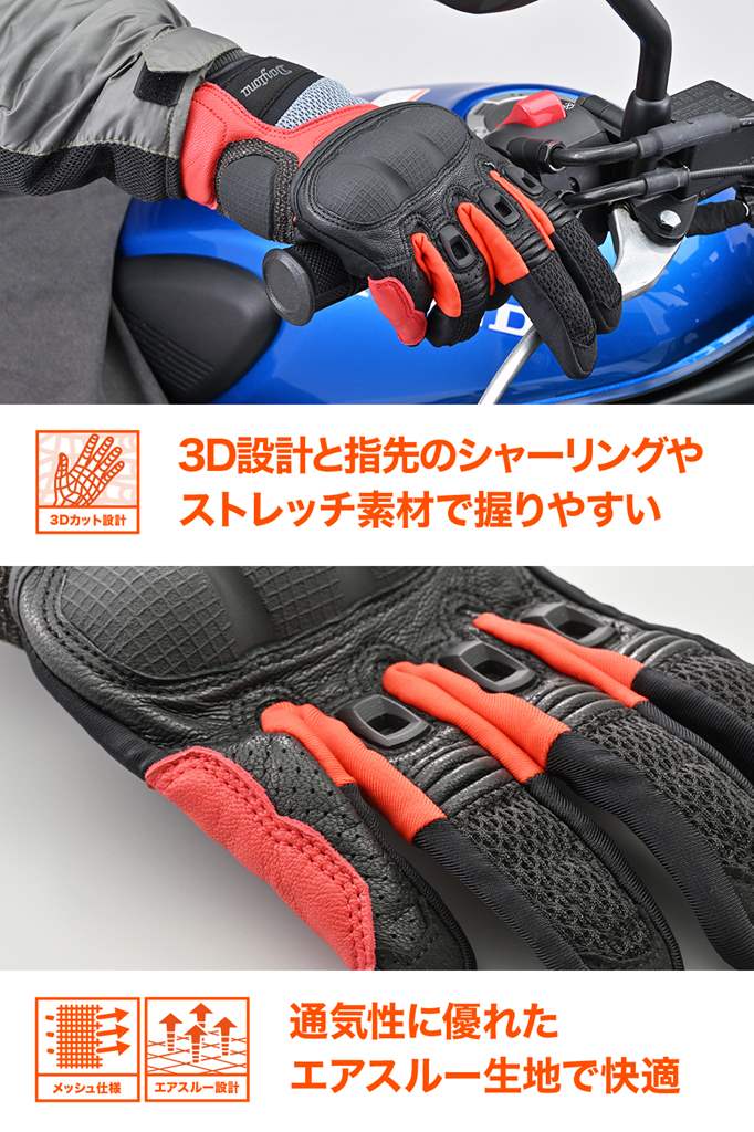 メッシュ+通気孔+本革で通気性と耐久性を両立させた春夏グローブ。手の甲側は通気性とストレッチ性に優れたメッシュ素材、手の平側は転倒やグリップによる摩耗を防ぐ本革を採用。ナックル、指、手首のプロテクターやパームスライダー、ケブラー生地に加えて手の平や各部に本革を多用した安全性の高いモデル。指に装備された通気孔が風を取り込み、真夏のライディンングを快適にします。指先にはストレッチ素材やシャーリングを施し、フローティング構造によりグリップが握りやすく快適に操作できます。・素材:ヤギ革(表地)/ポリエステル/ナイロン/ネオプレン/ケブラーシーズン:春夏通気性の高いメッシュ素材と、指部分に通気孔を装備。ストレッチ性の優れたメッシュ生地で握りやすいパームスライダーや指プロテクター、手首のプロテクター、ケブラー生地を採用し安全性を配慮転倒やグリップとの摩耗を考慮し手の平に本革を使用。摩耗性に優れるケブラーパッチを手の平に採用タッチパネル対応※手とグローブの密着度によりタッチパネルの感度は異なります。
