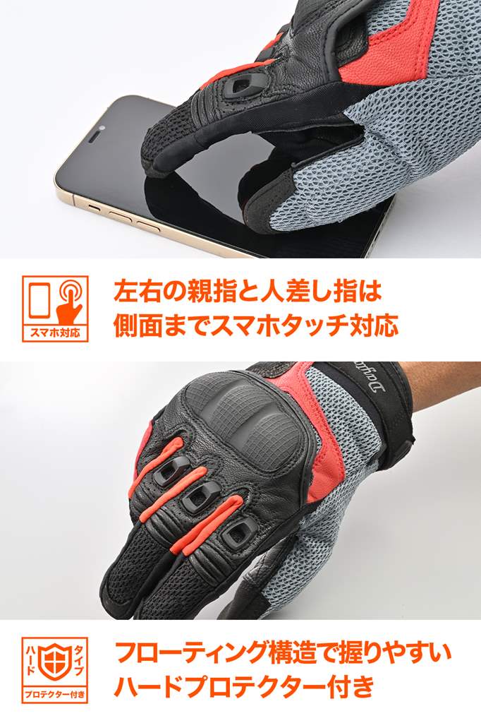 メッシュ+通気孔+本革で通気性と耐久性を両立させた春夏グローブ。手の甲側は通気性とストレッチ性に優れたメッシュ素材、手の平側は転倒やグリップによる摩耗を防ぐ本革を採用。ナックル、指、手首のプロテクターやパームスライダー、ケブラー生地に加えて手の平や各部に本革を多用した安全性の高いモデル。指に装備された通気孔が風を取り込み、真夏のライディンングを快適にします。指先にはストレッチ素材やシャーリングを施し、フローティング構造によりグリップが握りやすく快適に操作できます。・素材:ヤギ革(表地)/ポリエステル/ナイロン/ネオプレン/ケブラーシーズン:春夏通気性の高いメッシュ素材と、指部分に通気孔を装備。ストレッチ性の優れたメッシュ生地で握りやすいパームスライダーや指プロテクター、手首のプロテクター、ケブラー生地を採用し安全性を配慮転倒やグリップとの摩耗を考慮し手の平に本革を使用。摩耗性に優れるケブラーパッチを手の平に採用タッチパネル対応※手とグローブの密着度によりタッチパネルの感度は異なります。