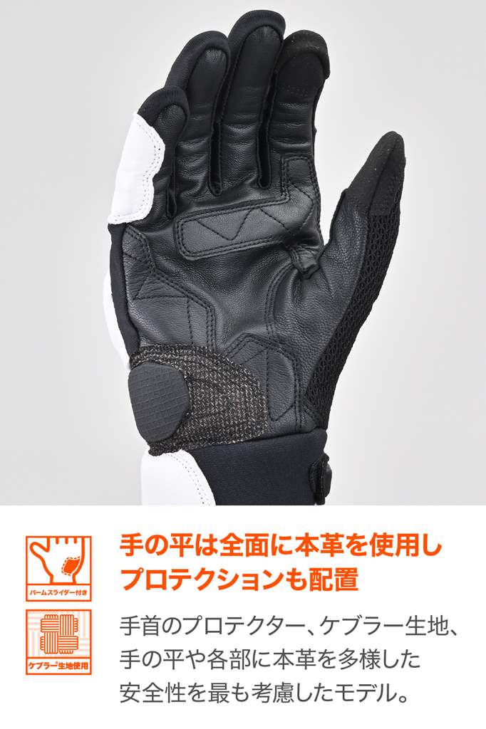 メッシュ+通気孔+本革で通気性と耐久性を両立させた春夏グローブ。手の甲側は通気性とストレッチ性に優れたメッシュ素材、手の平側は転倒やグリップによる摩耗を防ぐ本革を採用。ナックル、指、手首のプロテクターやパームスライダー、ケブラー生地に加えて手の平や各部に本革を多用した安全性の高いモデル。指に装備された通気孔が風を取り込み、真夏のライディンングを快適にします。指先にはストレッチ素材やシャーリングを施し、フローティング構造によりグリップが握りやすく快適に操作できます。・素材:ヤギ革(表地)/ポリエステル/ナイロン/ネオプレン/ケブラーシーズン:春夏通気性の高いメッシュ素材と、指部分に通気孔を装備。ストレッチ性の優れたメッシュ生地で握りやすいパームスライダーや指プロテクター、手首のプロテクター、ケブラー生地を採用し安全性を配慮転倒やグリップとの摩耗を考慮し手の平に本革を使用。摩耗性に優れるケブラーパッチを手の平に採用タッチパネル対応※手とグローブの密着度によりタッチパネルの感度は異なります。