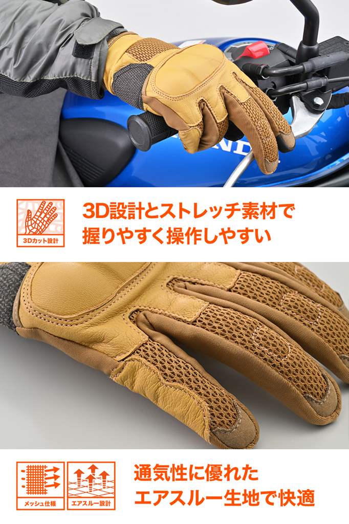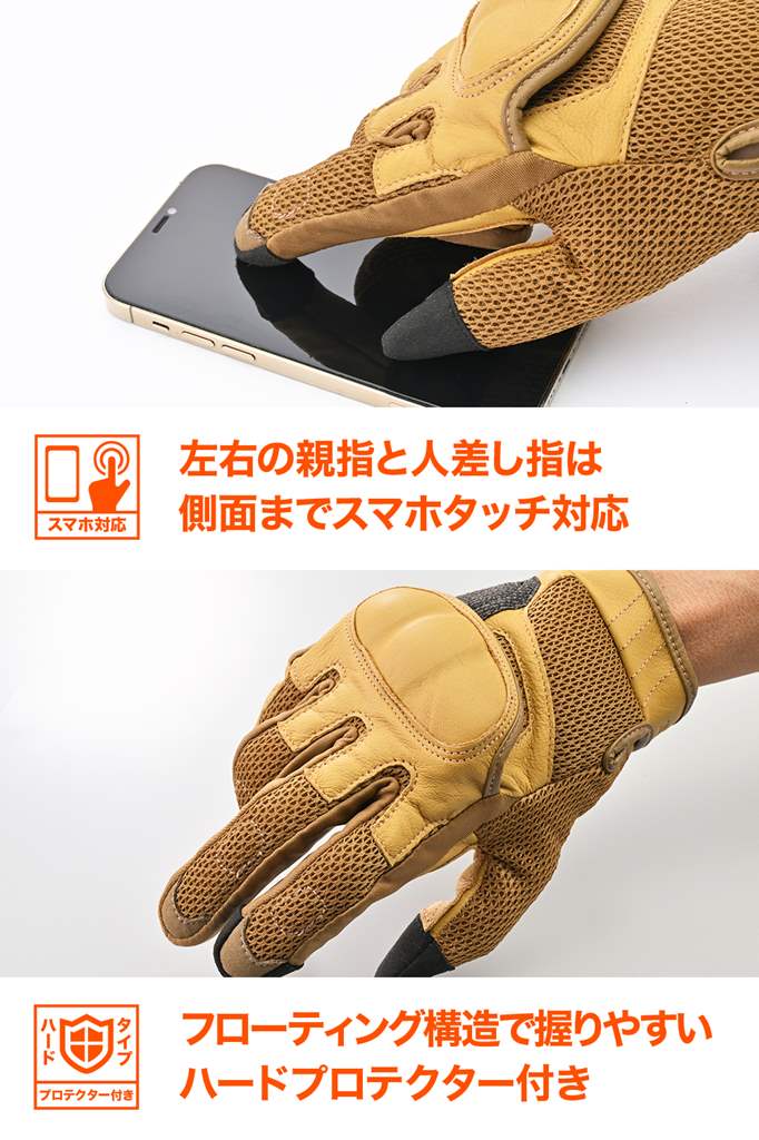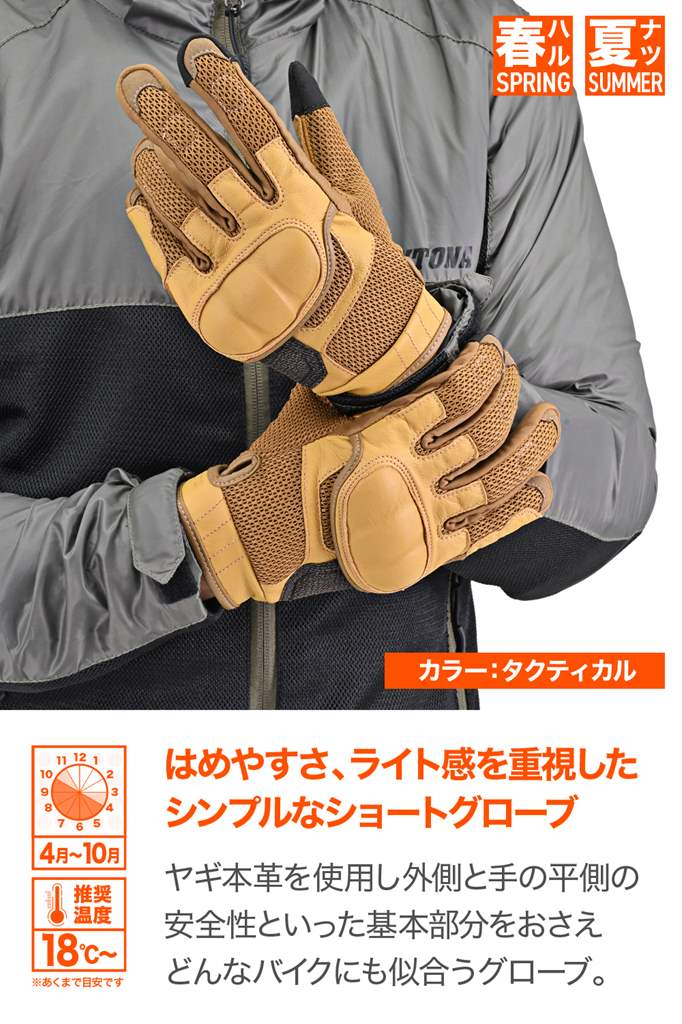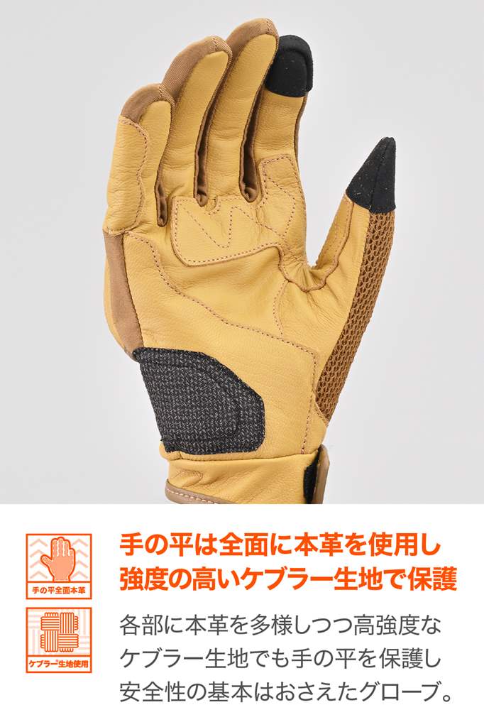 メッシュ+本革で通気性と耐久性を両立させたショート丈の春夏グローブ。手の甲側は通気性に優れたメッシュ素材、手の平側は本革を採用。転倒やグリップによる摩耗を防ぎ耐久性を確保しています。摩耗性に優れるケブラーパッチ付を手の平に採用。ナックルプロテクターがプロテクション効果を高め、フローティング構造によりグリップが握りやすく快適に操作できます。外側と手の平側の安全性を高め、はめやすさ、ライト感を重視。主張が少ないベージックなデザインは、クラシック系からスポーツバイクまで幅広く対応。・素材:ヤギ革(表地)/ポリエステル/ナイロン/ケブラーシーズン:春夏通気性の高いメッシュ素材を使用。ストレッチ性にも優れ握りやすいプロテクションで安全性を高め、はめやすさ、ライト感を重視転倒やグリップとの摩耗を考慮し手の平に本革を使用。摩耗性に優れるケブラーパッチを手の平に採用タッチパネル対応※手とグローブの密着度によりタッチパネルの感度は異なります。