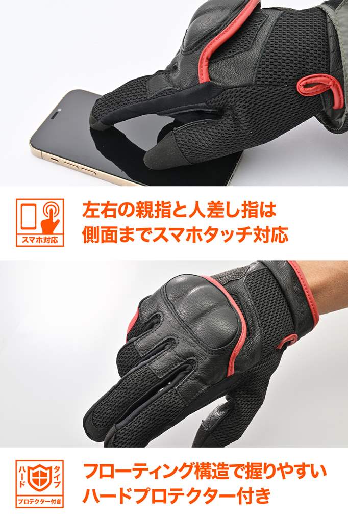 メッシュ+本革で通気性と耐久性を両立させたショート丈の春夏グローブ。手の甲側は通気性に優れたメッシュ素材、手の平側は本革を採用。転倒やグリップによる摩耗を防ぎ耐久性を確保しています。摩耗性に優れるケブラーパッチ付を手の平に採用。ナックルプロテクターがプロテクション効果を高め、フローティング構造によりグリップが握りやすく快適に操作できます。外側と手の平側の安全性を高め、はめやすさ、ライト感を重視。主張が少ないベージックなデザインは、クラシック系からスポーツバイクまで幅広く対応。・素材:ヤギ革(表地)/ポリエステル/ナイロン/ケブラーシーズン:春夏通気性の高いメッシュ素材を使用。ストレッチ性にも優れ握りやすいプロテクションで安全性を高め、はめやすさ、ライト感を重視転倒やグリップとの摩耗を考慮し手の平に本革を使用。摩耗性に優れるケブラーパッチを手の平に採用タッチパネル対応※手とグローブの密着度によりタッチパネルの感度は異なります。