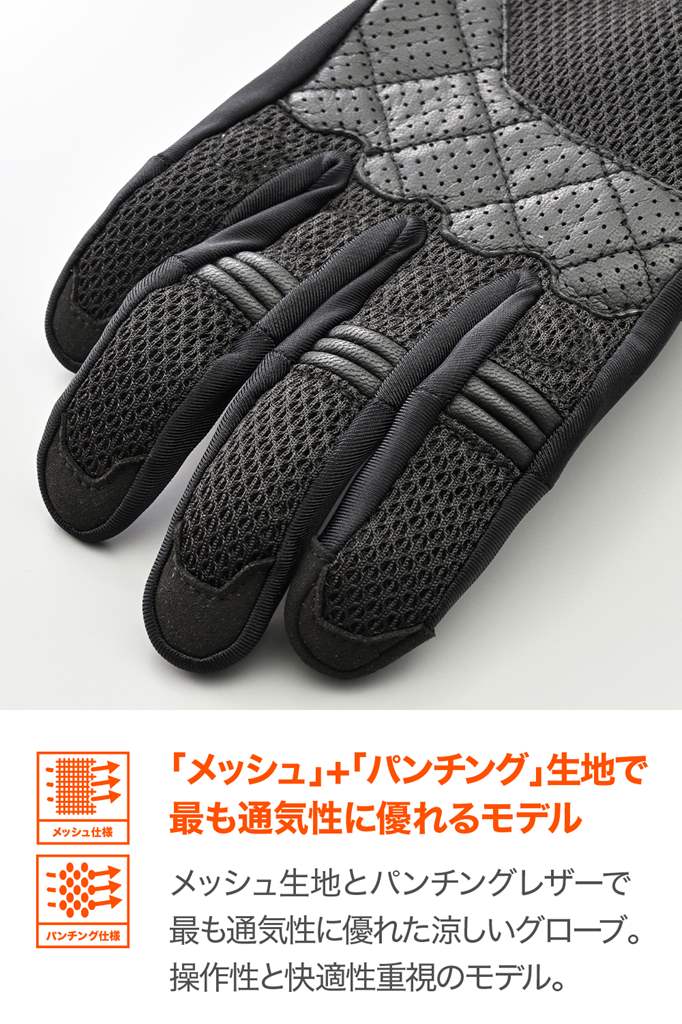 メッシュ+パンチングレザーで通気性と耐久性を両立させた春夏グローブ。