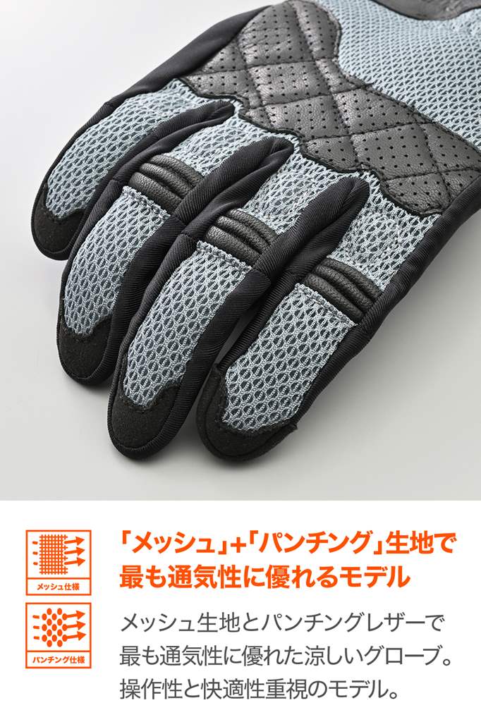 メッシュ+パンチングレザーで通気性と耐久性を両立させた春夏グローブ。手の甲はメッシュ生地、レザー部分にはパンチングを施し通気性に優れる。手の平、ナックル部分に本革を使用し、転倒やグリップによる摩耗を防ぎ耐久性を確保しています。 手の平側には摩耗性に優れるケブラーパッチ付き。・素材:ヤギ革(表地)/ポリエステル/ナイロン/ケブラーシーズン:春夏通気性の高いメッシュ素材を使用。ストレッチ性にも優れ握りやすいナックル部分の本革にはパンチングを施し通気性に優れる転倒やグリップとの摩耗を考慮し手の平に本革を使用。摩耗性に優れるケブラーパッチを手の平に採用タッチパネル対応※手とグローブの密着度によりタッチパネルの感度は異なります。