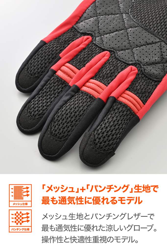 メッシュ+パンチングレザーで通気性と耐久性を両立させた春夏グローブ。手の甲はメッシュ生地、レザー部分にはパンチングを施し通気性に優れる。手の平、ナックル部分に本革を使用し、転倒やグリップによる摩耗を防ぎ耐久性を確保しています。 手の平側には摩耗性に優れるケブラーパッチ付き。・素材:ヤギ革(表地)/ポリエステル/ナイロン/ケブラーシーズン:春夏通気性の高いメッシュ素材を使用。ストレッチ性にも優れ握りやすいナックル部分の本革にはパンチングを施し通気性に優れる転倒やグリップとの摩耗を考慮し手の平に本革を使用。摩耗性に優れるケブラーパッチを手の平に採用タッチパネル対応※手とグローブの密着度によりタッチパネルの感度は異なります。