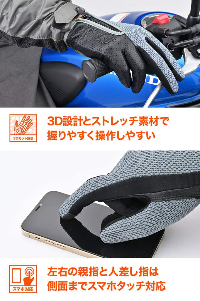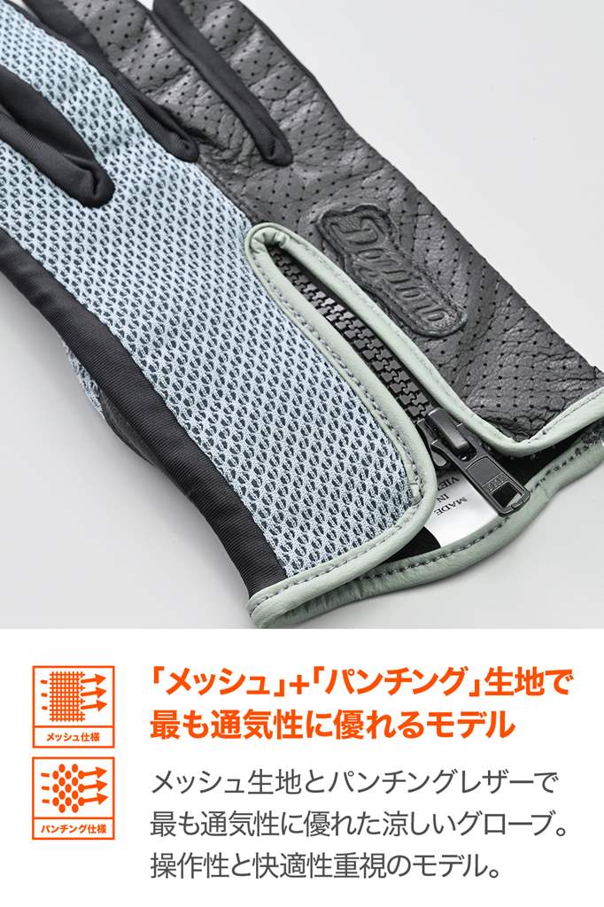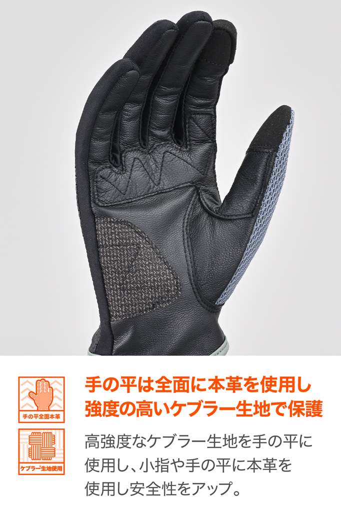 メッシュ+パンチングレザーで通気性と耐久性を両立させた春夏グローブ。中央にファスナーを配置し、装着のしやすいさを重視。小指側にはパンチング本革で安全性を考慮。セパレートデザインは、クラシックバイク向けに。手の平に本革を採用することにより、転倒やグリップによる摩耗を防ぎ耐久性を確保しています。手の平側には摩耗性に優れるケブラーパッチ付き。・素材:ヤギ革(表地)/ポリエステル/ナイロン/ケブラーシーズン:春夏通気性の高いメッシュ素材を使用。ストレッチ性にも優れ握りやすいファスナーが中央に配置され装着しやすい。小指側にはパンチングレザーで通気性と安全性を確保転倒やグリップとの摩耗を考慮し手の平に本革を使用。摩耗性に優れるケブラーパッチを手の平に採用タッチパネル対応※手とグローブの密着度によりタッチパネルの感度は異なります。