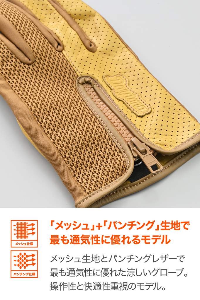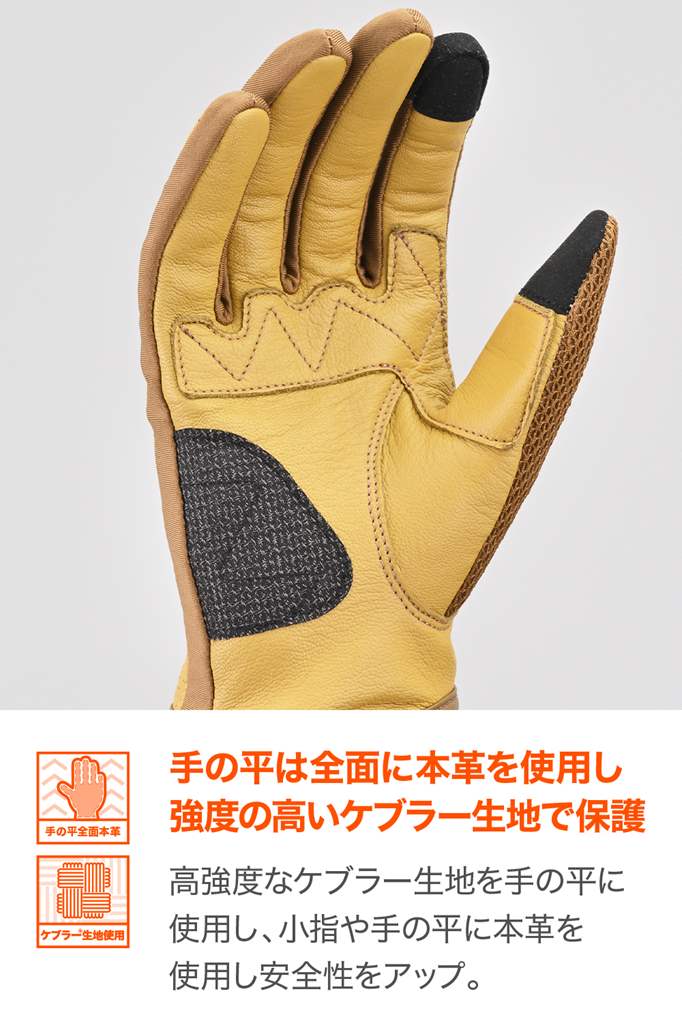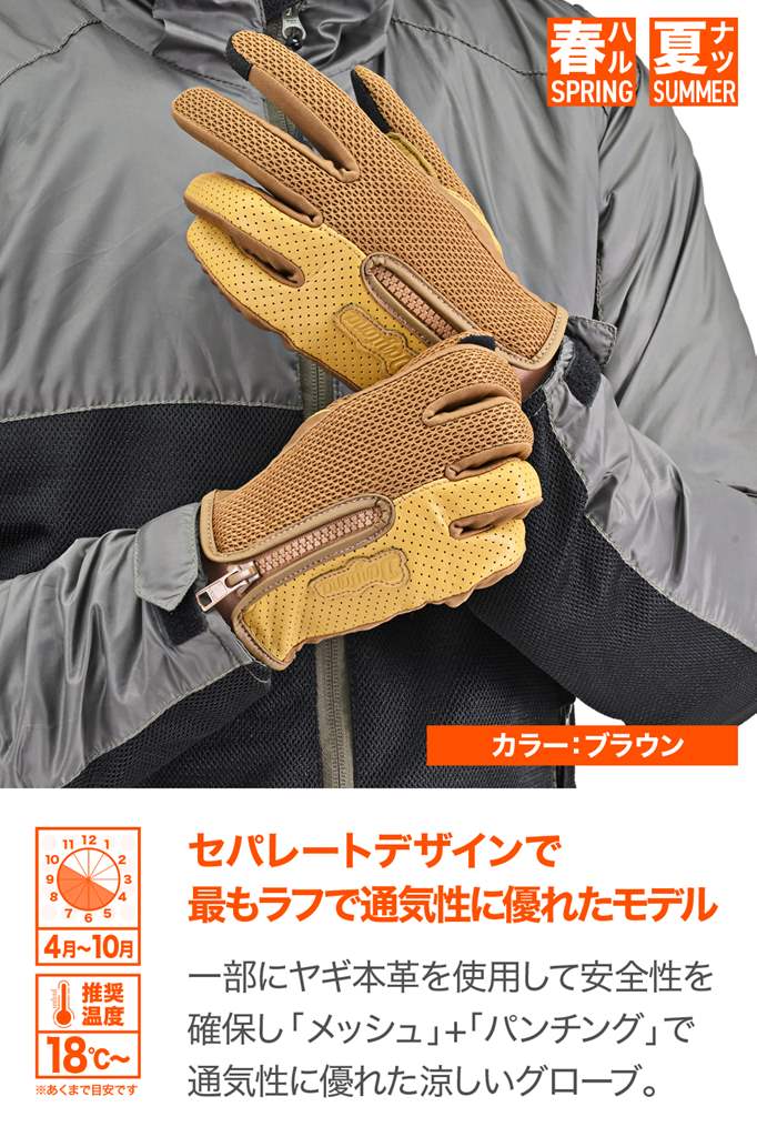 メッシュ+パンチングレザーで通気性と耐久性を両立させた春夏グローブ。中央にファスナーを配置し、装着のしやすいさを重視。小指側にはパンチング本革で安全性を考慮。セパレートデザインは、クラシックバイク向けに。手の平に本革を採用することにより、転倒やグリップによる摩耗を防ぎ耐久性を確保しています。手の平側には摩耗性に優れるケブラーパッチ付き。・素材:ヤギ革(表地)/ポリエステル/ナイロン/ケブラーシーズン:春夏通気性の高いメッシュ素材を使用。ストレッチ性にも優れ握りやすいファスナーが中央に配置され装着しやすい。小指側にはパンチングレザーで通気性と安全性を確保転倒やグリップとの摩耗を考慮し手の平に本革を使用。摩耗性に優れるケブラーパッチを手の平に採用タッチパネル対応※手とグローブの密着度によりタッチパネルの感度は異なります。