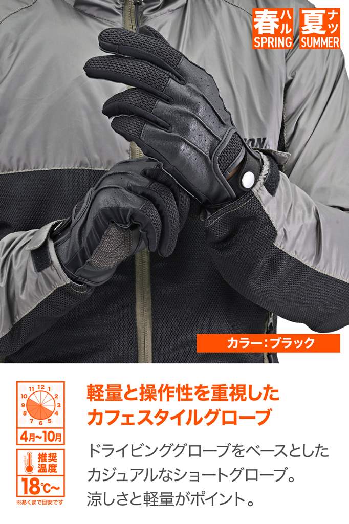 メッシュ+本革で通気性と耐久性を両立させた春夏グローブ。ドライビンググローブをモチーフにした操作性の高いモデル。手の甲にメッシュと本革を採用。涼しさと軽量が特徴。手の平に本革を採用することにより、転倒やグリップによる摩耗を防ぎ耐久性を確保しています。手の平側には摩耗性に優れるケブラーパッチ付き。・素材:ヤギ革(表地)/ポリエステル/ナイロン/ケブラーシーズン:春夏通気性の高いメッシュ素材を使用。ストレッチ性にも優れ握りやすいドライビンググローブをモチーフにした操作性が高いデザイン転倒やグリップとの摩耗を考慮し手の平に本革を使用。摩耗性に優れるケブラーパッチを手の平に採用タッチパネル対応※手とグローブの密着度によりタッチパネルの感度は異なります。