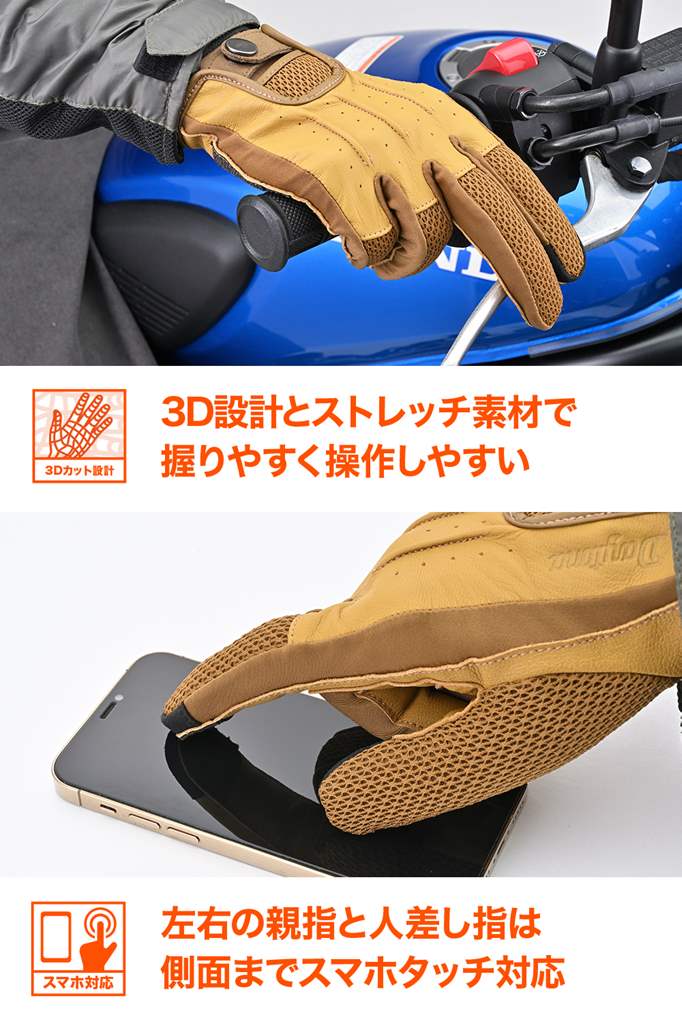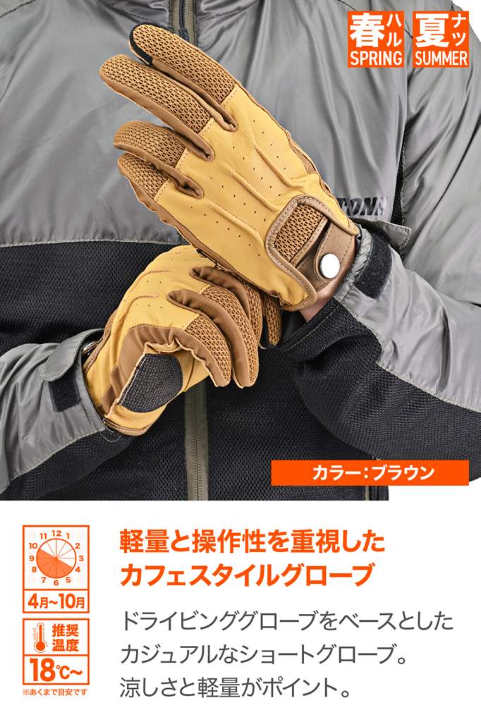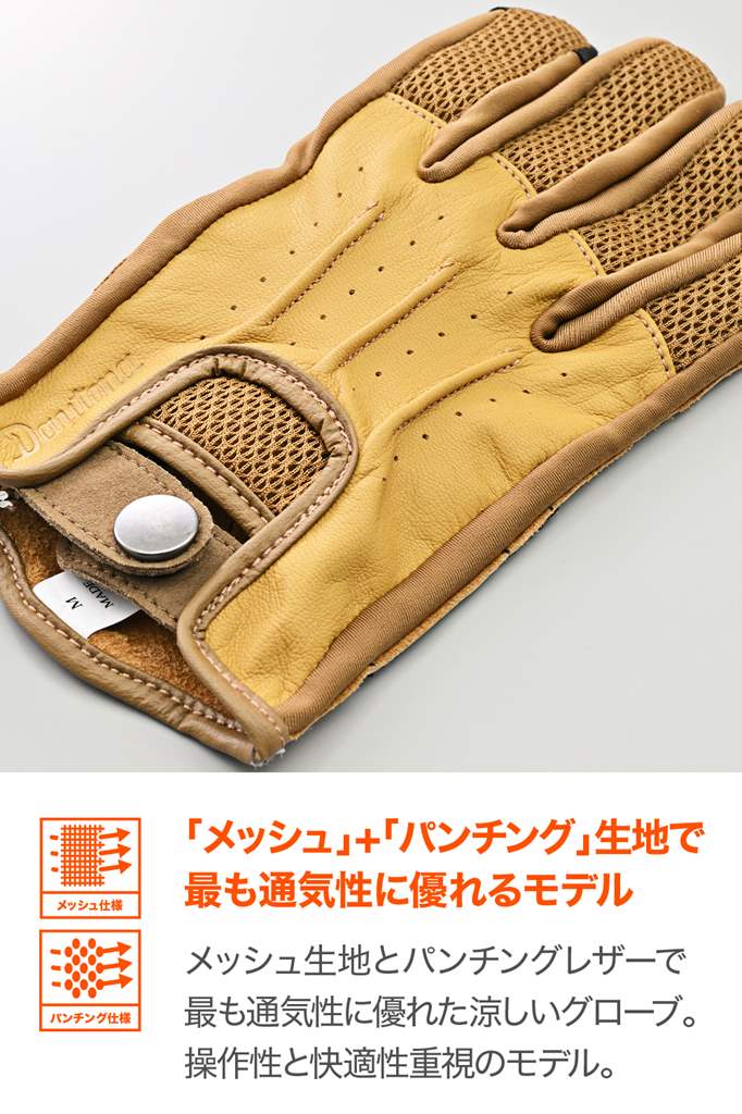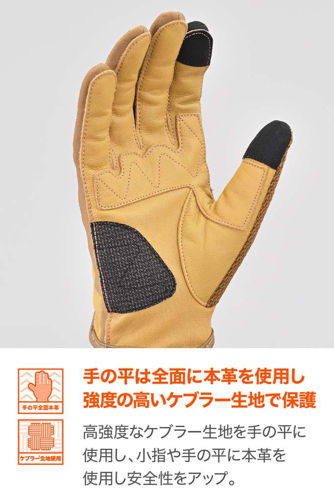 メッシュ+本革で通気性と耐久性を両立させた春夏グローブ。ドライビンググローブをモチーフにした操作性の高いモデル。手の甲にメッシュと本革を採用。涼しさと軽量が特徴。手の平に本革を採用することにより、転倒やグリップによる摩耗を防ぎ耐久性を確保しています。手の平側には摩耗性に優れるケブラーパッチ付き。・素材:ヤギ革(表地)/ポリエステル/ナイロン/ケブラーシーズン:春夏通気性の高いメッシュ素材を使用。ストレッチ性にも優れ握りやすいドライビンググローブをモチーフにした操作性が高いデザイン転倒やグリップとの摩耗を考慮し手の平に本革を使用。摩耗性に優れるケブラーパッチを手の平に採用タッチパネル対応※手とグローブの密着度によりタッチパネルの感度は異なります。