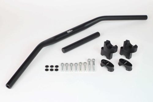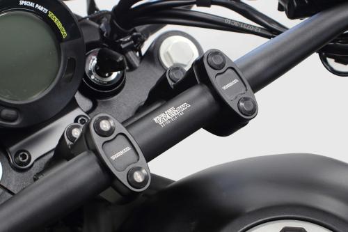 本製品は、純正ハンドルパイプ径Φ22.2mmからテーパーハンドル(クランプ固定部:Φ28.6mm スイッチ固定部からエンド部:Φ22.2mm)へ変更することができるハンドルセットになります。テーパーハンドルに合わせ、ハンドルクランプホルダー部をΦ28.6mmに大径化し、それに伴い、クランプホルダーの形状変更をすることで、ボリューム感のあるハンドル周りにすることができます。又、ハンドルパイプを固定するハンドルクランプホルダーは、純正ハンドルクランプホルダーを利用し、長さを延長する一般的なものではなく、純正ハンドルクランプホルダーにバーパイプを採用し、クランプホルダーを延長しています。これにより、バーパイプにUSB電源ハブやカメラ等の固定が可能になります。ハンドルポジションは、純正ハンドルパイプとほぼ同じ位置なので、クラッチケーブルやスロットルケーブルの変更は必要なく、純正ハンドルパイプとの交換作業だけで、簡単に取り付けできます。ロータイプテーパーハンドルの採用で、純正ハンドルパイプと比べて高剛性になり、操作性を高めると共に直進安定性が向上します。ハンドルパイプへ伝わる振動が軽減し、安定した走行が可能になる為、通勤、ツーリングなど、快適なライディングをお楽しみいただけます。ハンドルクランプホルダー:アルミ削り出しブラックアルマイト仕上げ ブラックボルトキャップ付属 SP武川レーザーマーキングロゴ入りテーパーハンドルパイプ:アルミ製ブラックアルマイト仕上げ SP武川レーザーマーキングロゴ入り■ 注意事項※SP武川製アルミハンドルパイプには、純正バーエンドの取り付けはできません。別途SP武川製2ピースバーエンド(SP武川製ステリングハンドルパイプ用)の同時装着が必要になります。※SP武川製スクリーンキット(ハンドルクランプタイプ) 品番09-11-0330との同時装着はできません。■SP武川製メーターバイザーキット 品番09-11-0350 との同時装着は可能です。