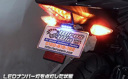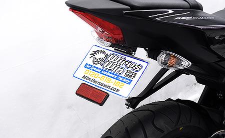 ノーマルフェンダーを外して取り付けます。後加工の必要もなく簡単に装着することが出来ます。ナンバー灯は白色LEDタイプを採用しています。配線は純正と同じカプラーになっていますので、差し替えるだけで簡単に繋げられます。純正のリフレクター(反射板)、ウインカーも取り付けられるようになっています。フェンダーレス化することにより、タイヤが露出されレーシーな感じに仕上がります。SUS304ステンレス製でバフ仕上げの為、高級感バツグンです。かなり目立ち、ドレスアップとしては最高です。フェンダーレスキットは、長い純正フェンダー(泥よけ)を取り外すことにより、すっきりとしたリア周りに仕上げることを目的とした商品です。またリア周りのメンテナンスやレース等の使用における空気抵抗を抑える理由から、弊社製品はナンバープレートホルダーの角度を変更することができる設計になっています。しかし、道路交通法の保安基準ではリフレクター(反射板)の装着義務やナンバープレートの角度を約45度以内(後方からナンバープレートを目視で確認できる角度)とすることが定められております。ウイルズウィン社製品は仕様としてナンバープレートホルダーの角度調節することは可能ですが、一般公道等の道路交通法を遵守しなければならない道路では保安基準を超えた角度(正確に目視できない角度)での製品の使用は法律で禁じられておりますので絶対におやめください。
