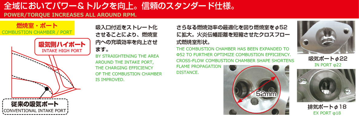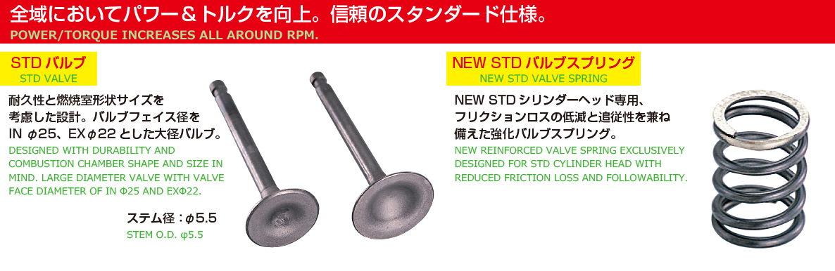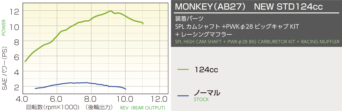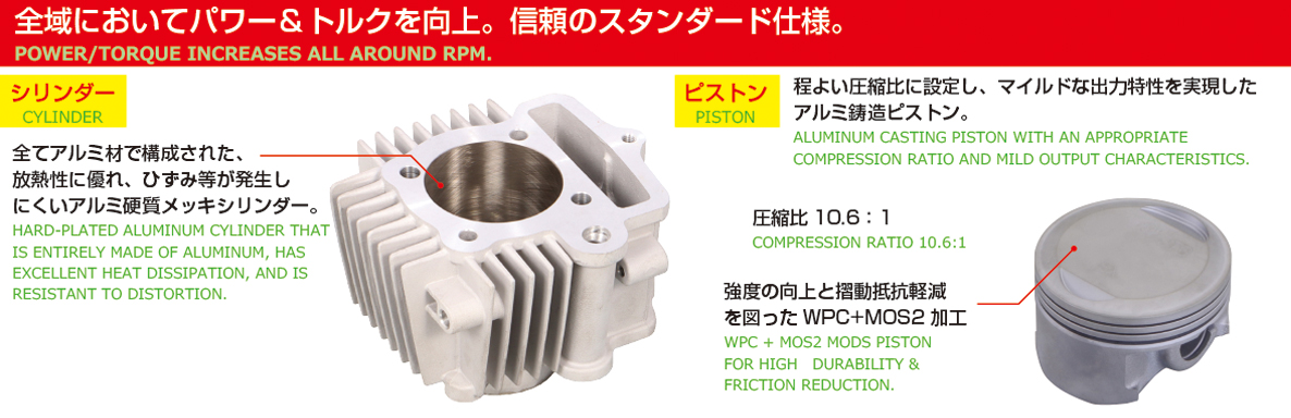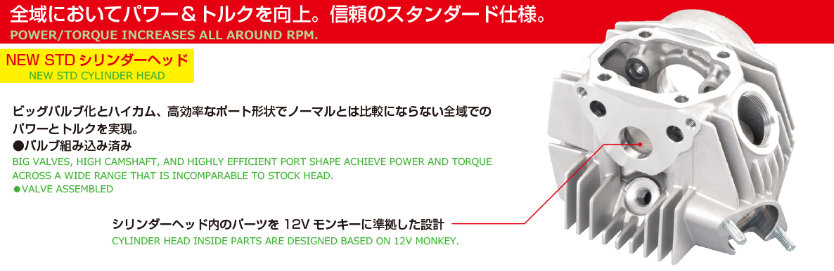 ストリートに適した圧倒的なトルク感!全域においてパワー&トルクを向上。信頼のスタンダード仕様!燃焼室形状を最適化させたシリンダーヘッド付属。高効率なポート形状、ビッグバルブ、ハイカム、最適なハイコンプピストンの採用等、ストリートでトルク感あふれる余裕のある走行が可能です。モンキー/ゴリラFNO,Z50J-2000001〜FNO,AB27-1000001〜1899999モンキーバハ全車種XR50R/CRF50FAE03全車種アルミ硬質メッキシリンダー排気量:124ccボア径:φ54ストローク:54.0mm (ロングストローク)バルブ組込済ピストン:鋳造/WPC+MOS2加工圧縮比:10.6:1