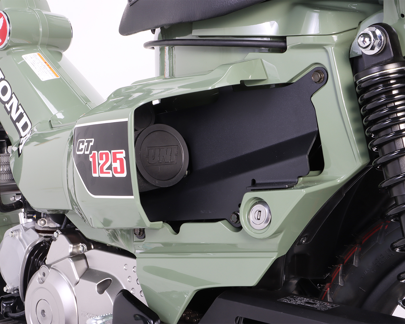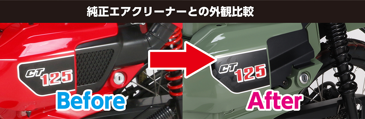 高性能フィルター採用で、吸気効率アップ!ノーマルエアクリーナーボックスでは対応できない、ハイチューンエンジンなどの吸気効率を向上させるエアクリーナーです。※燃調セッティングはノーマルエンジン、キタコ製JMCA認定マフラーもしくはノーマルマフラーの組み合わせであれば、セッティングは不要です。CT125ハンターカブJA65全車種左側サイドカバー内装着タイプブリーザーフィルター付属ステー:スチール製ブラック仕上げ補修用UNIフィルター(PK-7E φ32/φ46)515-1100120