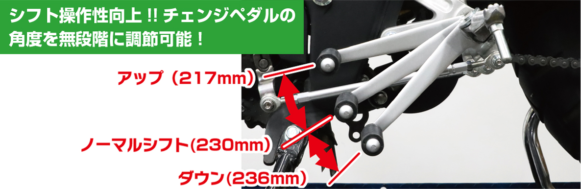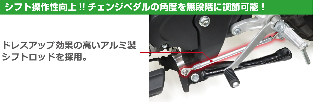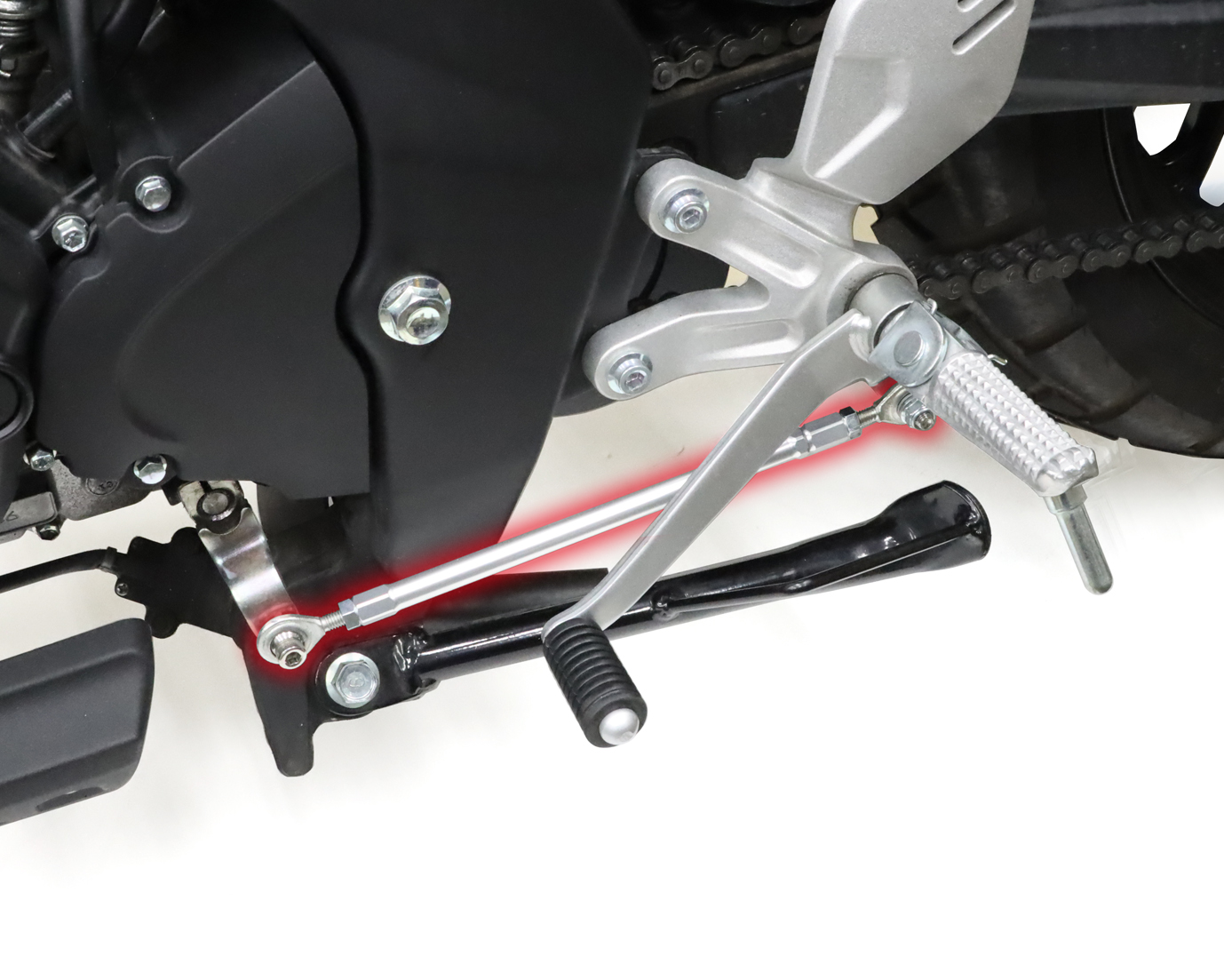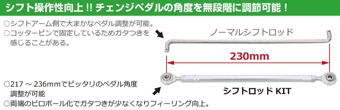チェンジペダルの角度を無段階に調節可能!シフト操作性向上!!純正シフトロッドと交換することで、シフトロッドの長さが変えられるようになりチェンジペダルの高さ調整が可能になります。両端をピロボール化することにより、ガタつきが少なくなりシフトフィーリングが向上し、チェンジペダル周りの質感もアップします。ライディングポジションに合わせたチェンジペダルの調整により足首の負担を軽減し快適なライディングを実現します。XSR125(RE46J)BVF1ピロボール:スチール製シフトロッド:アルミ製シルバーアルマイト仕上げシフトリンク調整可能幅:最大約19mm(217〜236mm ノーマル約230mm)※基本的なシフトペダル位置はシフトアームの取付角度を決め、シフトリンクで微調整を行って下さい。