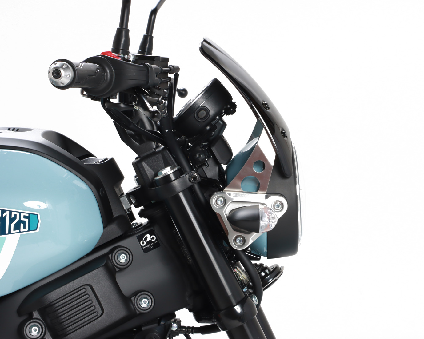 フロント周りの印象変化!緩やかな曲線形状が車体にマッチするドレスアップエアロバイザー!フロント周りを引き締めるポリカーボネイト製の小型バイザー。汎用のダークスモークタイプスクリーンを採用。○スクリーンサイズ(縦×横):約190mm×210mm※バイザー本体の材質特性、また製造工程上で多少のキズ、汚れ等があります。予めご了承の上、お買い求めください。XSR125(RE46J)BVF1ボルトオンスクリーン:ポリカーボネイト製取付ステー:ステンレス製ヘアライン仕上げ