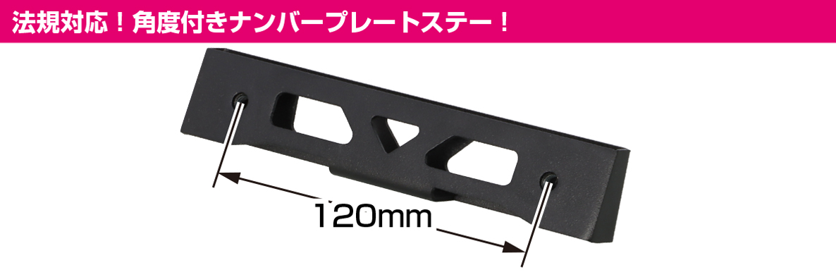 法規対応!角度アップのナンバープレートステー!ナンバープレート設置角度を傾けるナンバープレートステーです。※ナンバープレート取付角度の保安基準は「下向き15°〜上向き40°の範囲内」となります。取り付け後範囲外の角度となると道路運送車両法に抵触します。クロスカブ110(JA45/JA60)・CT125ハンターカブ(JA55/JA65)・スーパーカブC125(JA48/JA58/JA71)・PCX125(JK05)ボルトオンスチール製/ブラック塗装仕上げ取付ピッチ:120mmノーマルリヤフェンダー専用※ナンバープレート取付には付属のM6×10のキャップボルトを使用して下さい。※取付ピッチ幅が120mm以外のナンバープレートには使用できません。