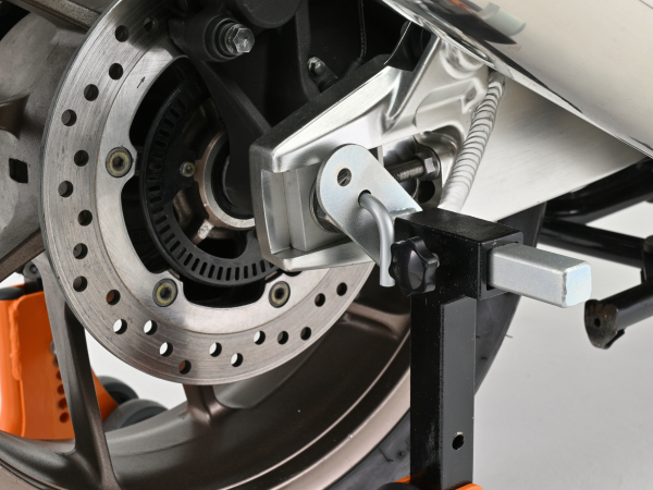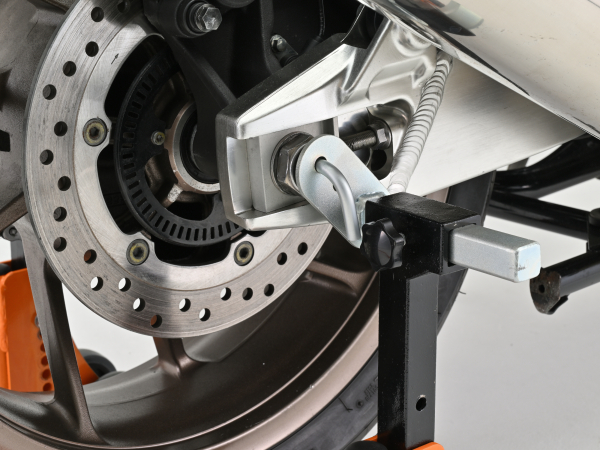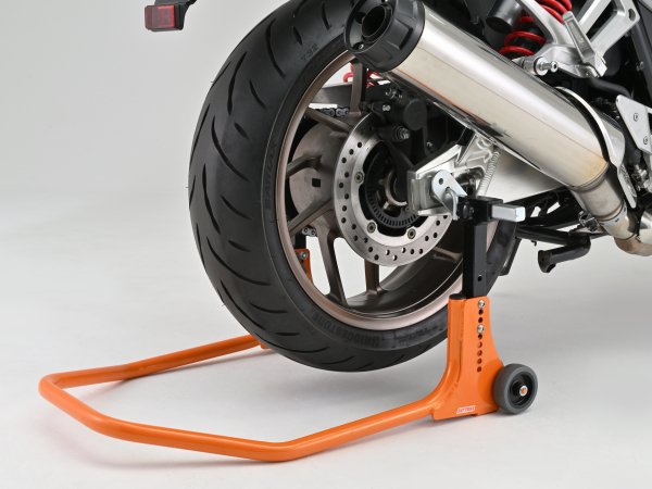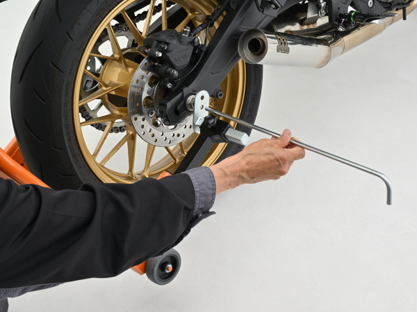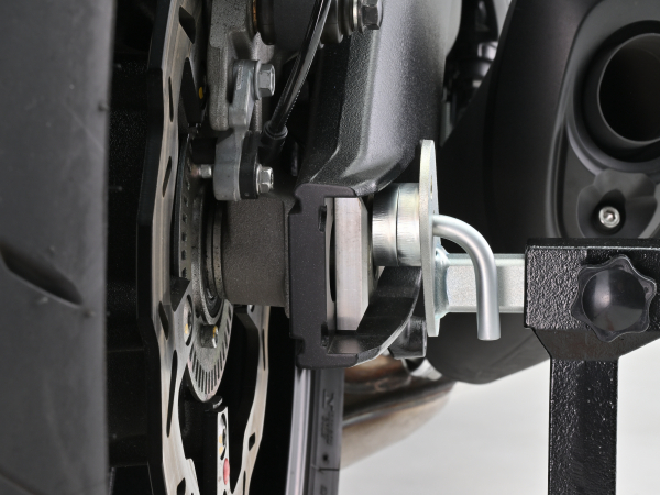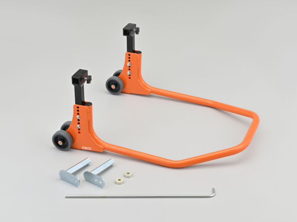 貫通アクスルシャフト車ならストレスフリーでリアスタンドUPシャフトが中空の貫通アクスルシャフト用スタンド。リアホイールの脱着を伴わない作業(洗車やチェーンメンテナンス等)であれば、スイングアームからスタンドが外れないので、V字やL字受けより安心してリフトアップできるので初心者におすすめです。シャフト受け穴は上下2か所で、前後、上下約14mmのアジャストが可能。スイングアームよりアクスルナットが奥まった車両は、付属のカラーでクリアランス(片側2枚重ね、最大約17mm)を保つことで、スタンドがスイングアームに当たることを防げます。・貫通アクスルシャフト用アタッチメント付属・シャフト:Φ8(有効直線部450mm)・カラー:2個(外径30mm×厚さ8.5mm)・シャフト受け穴2か所・リフトアップ量:280〜355mm(受け下穴〜受け上穴)・対応アーム幅:350〜395mm(カラー使用時最大?17mm減)・耐荷重:200kg※貫通アクスルシャフト車専用です。 ※Φ8シャフトを完全に通せない車両には使えません。※使用中はリアホイール脱着作業ができません。※重量車ほどリフト量を大きくすると操作が重くなりますので、上穴よりも下穴を使う方が操作は軽めに働きます。※必ずシャフト受けの傾き(斜め)方向は車体後方に向けて使用してください。車体前方に向けるとスタンド本体の重心が悪くなり危険です。※Φ8シャフトに車重以外はかけないようしてください。スタンドアップ後に跨って全体重をかけたり、上下に揺らしたりするとΦ8シャフトが歪んだり曲がる場合があります。