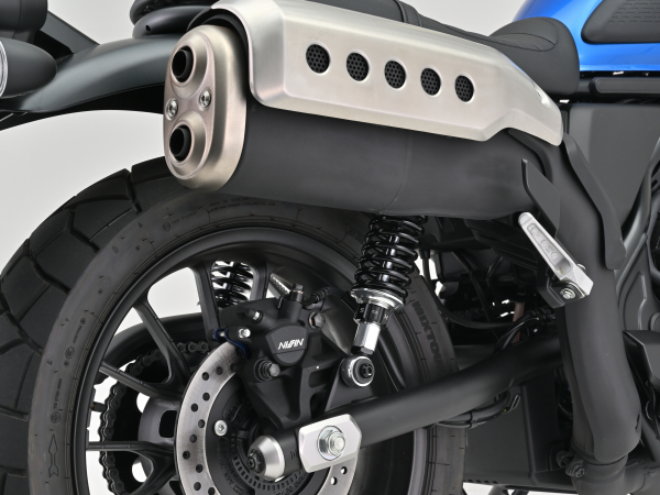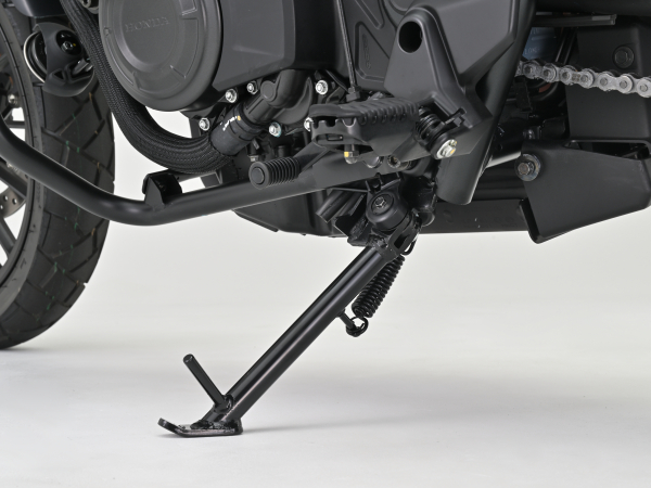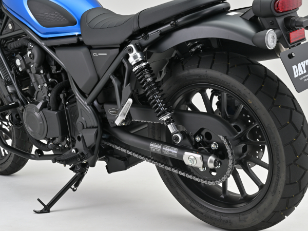 CL500専用バネレート採用シート高を約28〜42mm下げて足付きを改善。ローダウンながら優れた乗り心地、コーナーリング性能、ギャップ走破性を発揮。アルミ製のリアショックはCL500専用のバネレートを採用。専用ショートサイドスタンドが付属するので安定した駐車が可能です。アジャスタブルリアショックとショートサイドスタンド、スタンド取り付け用段付きボルトのセット。■アジャスタブルリアショック・調整幅(自由長):338〜353mm ※ノーマル長:385mm・純正比?32mm〜?47mmの間で無段階に調整が可能・伸び側減衰調整20段(※1)■ショートサイドスタンド(※2)・フロントフォーク突き出し0〜+10mm、リアショック長?32mm〜?47mmに対応※1 伸側減衰調整20段、21段以上まで動きますが、21段以上は減衰力が変化しません。※2 純正段付きボルトは使用不可。※車体姿勢が大きく変わるためヘッドライトの光軸調整が必要な場合があります。※CL250は車重が軽いため装着不可。車種:CL500年式型式:2023(CL500AP_8BL-PC68)