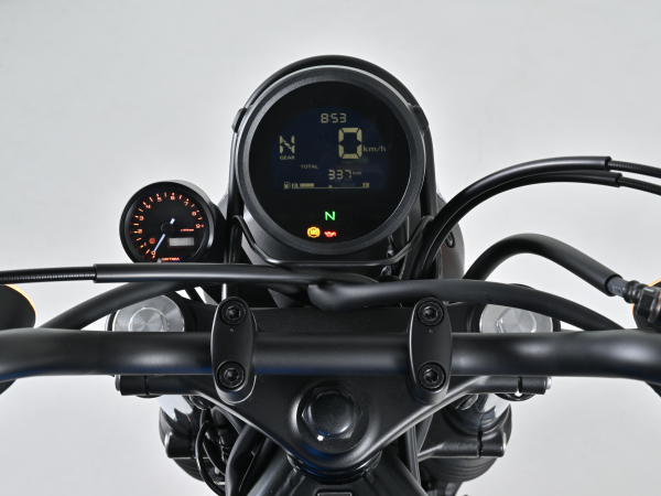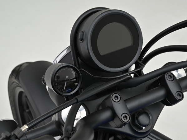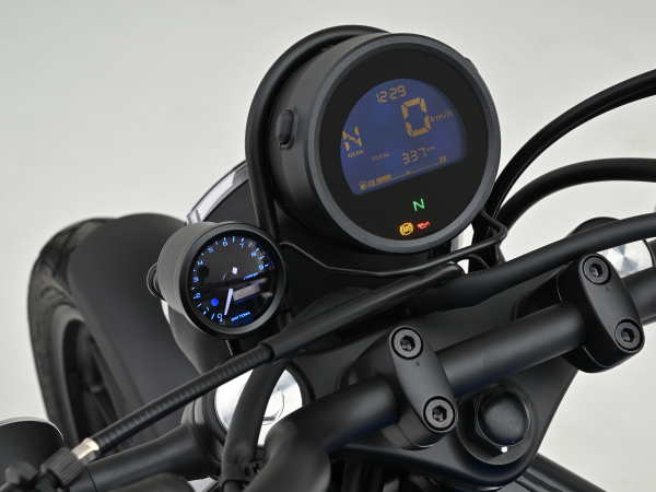 CL250/500('23)にボルトオン装着できるVELONAΦ48タコメーターキット純正スピードメーターの左側に VELONAΦ48タコメーターを装着できるボルトオンキット。実用回転域にマッチした9000rpm表示(ブラックボディ/ブラックパネル)。取付ステーはメーターへの振動を軽減するラバーマウント式です。・バックライトカラー3色切り替え式(白、青、橙)・オープニング機能付き・シフトUPワーニングランプ付き・サブモニター表示:電圧/最高回転数※振動対策のため針の反応速度は遅めになっています。※針、液晶共にMAX9000rpm表示となります。※メーターケース内外の気温差や湿度により、ガラス面が結露して曇る場合があります。※純正アクセサリーソケットの同時装着不可。(電源取り出し場所が共通のため)※CL250/500エアロバイザーキット(42237/47767)との同時装着はできません。【HONDA】車種:CL500年式型式:2023(CL500AP_8BL-PC68)車種:CL250年式型式:2023(CL250AP_MC57)