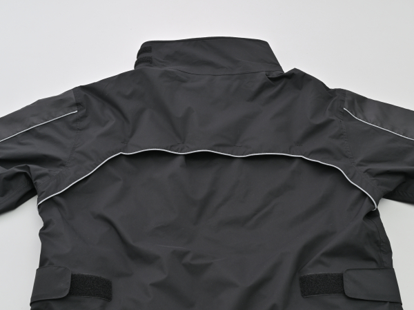 ライダーが濡れないことを最優先に考えた、バイク用 防水・透湿 高性能レインウェアジャケットは、動きやすいストレッチ生地を使用し、斜めに配置したフロントフラップがファスナーからの浸水を防止。首元には内側がクロロプレン素材の高い襟を採用し、袖口は二重袖とサムホール、裾は二重裾とドローコードで雨滴の侵入を防ぎます。背中のベンチレーションがムレを防ぎ、バタツキを防ぐ幅広の面ファスナーはグローブでも使いやすい設計です。【動きやすいストレッチ生地】快適性向上のためストレッチTPUコート生地を採用。耐水圧20,000mm、透湿度5,000mm。【斜めファスナーフラップで浸水を防ぐ】ファスナーフラップを斜めにしたことで雨滴が流れ落ち、ファスナーからの浸水を防ぐ。【腹部からの浸水を防ぐ】雨滴の溜まる腹部からファスナーをずらすことで、ファスナーからの浸水を防ぐ。・カラー:ブラック ・サイズ:L(身長170〜180 / バスト92〜100 / ウエスト79〜94(cm)) ・素材:ポリエステル100% / TPUコート(裏地) ・初期耐水圧:20000mm JIS L1092 B法・初期透湿度:5000mm JIS L1099 B-1法※身長は目安であり、体型によりあてはまらない場合があります。 ※バスト、ウエストは当社独自の計測方法に基づく寸法となります。 ※バスト、ウエストは商品の下に着るウエアの上から計測ください。※実際の商品は個体差が生じる場合があります。