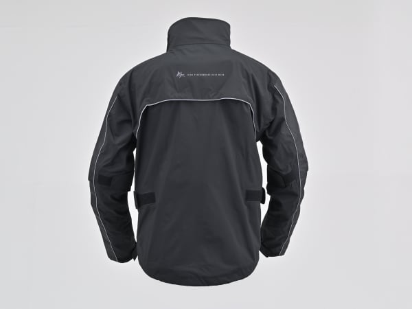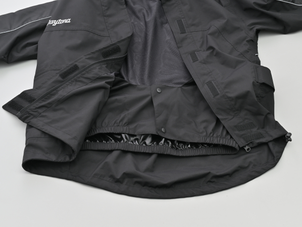 ジャケットは、動きやすいストレッチ生地を使用し、斜めに配置したフロントフラップがファスナーからの浸水を防止。首元には内側がクロロプレン素材の高い襟を採用し、袖口は二重袖とサムホール、裾は二重裾とドローコードで雨滴の侵入を防ぎます。背中のベンチレーションがムレを防ぎ、バタツキを防ぐ幅広の面ファスナーはグローブでも使いやすい設計です。
