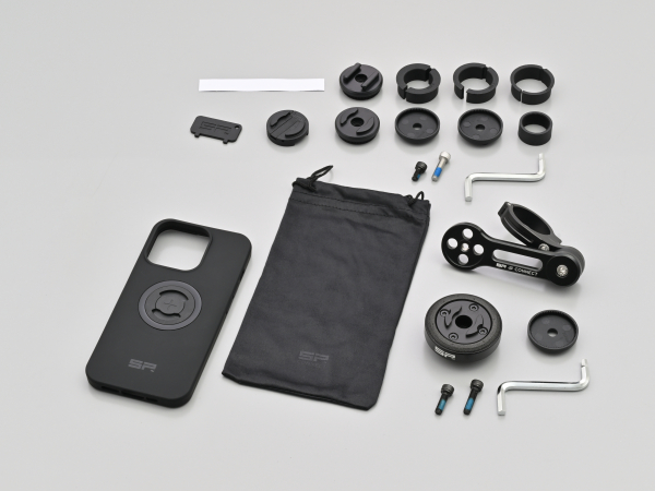 フォンケース、モトマウントプロ、アンチバイブレーションモジュールの3点セットパイプハンドルにクランプするマウントとアンチバイブレーションモジュール、新型【SPC+】採用のフォンケースのセット。付属のアタッチメント(Φ22.2/25.4/28.6/31.7mm)で、様々な径のハンドルに取り付けが可能です。・対応機種:iPhone15 Pro
