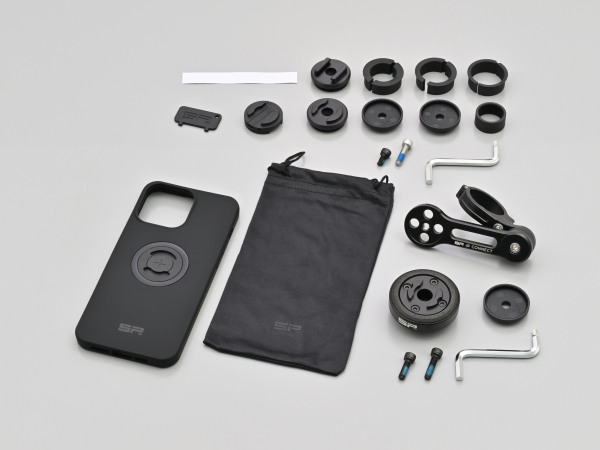 パイプハンドルにクランプするマウントとアンチバイブレーションモジュール、新型【SPC+】採用のフォンケースのセット。付属のアタッチメント(Φ22.2/25.4/28.6/31.7mm)で、様々な径のハンドルに取り付けが可能です。