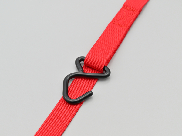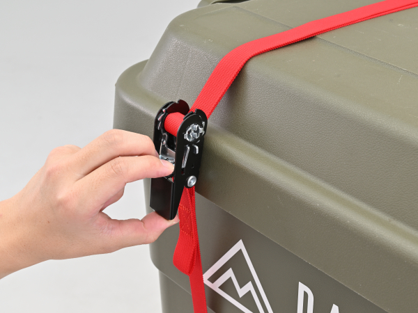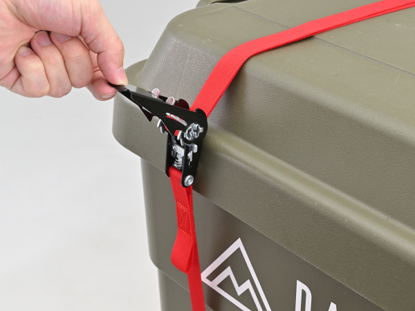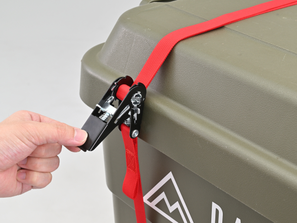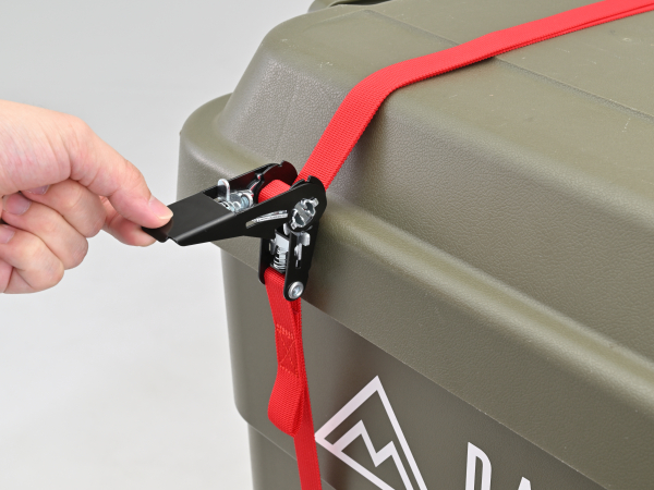 荷物の固定に最適な耐荷重100kgのラッシングベルト。本体が小型なのが特長です。先端はフックタイプ。余ったベルトをまとめる面ファスナー付属。