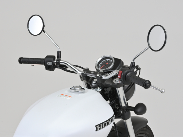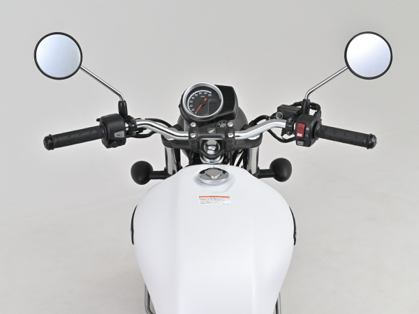 純正ハンドルよりグリップ位置を15mm低く、手前内側に絞ることで生まれる程よい前傾姿勢がスポーティ。エンド部には6mmネジ穴加工済みで、純正のバーエンドの他にM6サイズのバーエンドミラーアダプターが装着可能です。全高+?40mm/全幅+?20mmの継続検査基準値内に収まる設計のため、記載変更等は必要ありません。・クロームメッキ仕上げ ・スイッチボックス回り止め穴開け加工済み ・取付位置決め用ポンチマークあり ・M6バーエンド&バーエンドミラーアダプター対応 ・車検対応※GB350Sにも適合しますが、高さはほとんど変わらず両端に絞りがついた形状になります。※純正バーエンド装着状態で継続検査の公差基準を満たす設計です。純正以外のバーエンドでは、継続検査時に適合外となる場合があります。【HONDA】車種:GB350年式型式:2023【GB350P J_NC59】