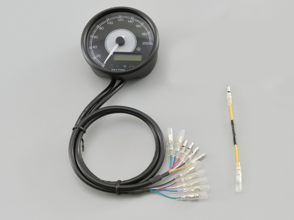 ニードルタイプのスピードメーターと液晶表示のタコメーター、インジケーターを1メーター内に組み合わせたコンパクトな多機能メーター。Φ80のステンレスボディ仕様。【機能】?アナログスピードメーター(km/h)?デジタルタコメーター検出可能点火方式:クランク1回転/1点火、2回転/1点火、1回転/2点火、1回転/30パルス出力(ハーレーダビッドソンの一部モデルで使用する方式です。クランクポジションセンサーからパルス信号を入力する場合に使用します。)?電圧計?最高速記録?最高回転数記録?オドメーター?2トリップメーター(TRIP1/TRIP2)?インジケーター(警告灯/ニュートラル/ハイビーム/ウインカー左/ウインカー右)・薄型ステンレスボディ(Φ80)・ステッピングモーター駆動 ・球面レンズ・ホワイトLED(照明) ・直流12V電源専用 ・インジケーター機能 ・外部操作スイッチ接続端子付き ・レジスターハーネス付属 ・電気式スピードメーター採用車両(車速センサーから0V?5V交互パルス信号がピックアップできる車両)用・フルトランジスタ&CDI点火の直流12Vバッテリー搭載車両用※純正スピードメーターが機械式の車両(メーターケーブルを使用する車両)は別売りのデンスピ変換アダプターまたは非接触スピードセンサーが必要です。※ECUやCDIより回転信号出力が取れないタコメーター未装着車両、または純正機械式タコメーター車両に取り付ける場合は別売りのパルスジェネレーターが必要です。
