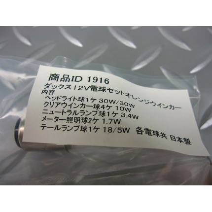 ・6Vダックスを12V化した場合、電球交換が必要です。もしくは12Vダックスの交換用電球としても使用できる。【セット内容】・ヘッドライト電球×1ケ・テールランプ電球×1ケ・クリアウインカー電球×4ケ・メーター照明、インジゲーター電球×各1ケ・Nランプ電球×1ケ※電球はSTANLEYもしくはKOITO製です。注意:メーター照明、インジゲーター電球→1.7Wですが、ニュートラル電球は3.4Wです。同形状ですので、取り付けの際にはご注意ください。ダックス・シャリィ6V→12V化コンバートキットNO1922はこちら