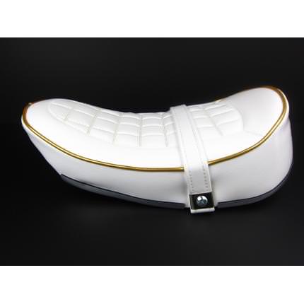 ・モンキー用ローダウンK0シートTLシート中央部分のアンコ抜きを施し、シート高を抑えたデザインタンデムベルト付き段付きデザインメッキサイドモール5Lモンキーに使用できる取り付けステーとボルトが付属します材質 合成皮革(シート表皮)、スチール塗装(シートベース)スチール塗装(シートステー)モンキーノーマルフレームにボルトオン、純正リアキャリア適合不可注意 FIモンキー、ゴリラ、4Lモンキーへは取り付けできません。*在庫切れの場合、納期までに1週間ほどいただく場合がございます。シートは国内で製造しています。カラー :シート面 ホワイトエナメル後方部 ホワイトエナメルパイピング ゴールドエナメルホンダロゴ ゴールドエナメル
