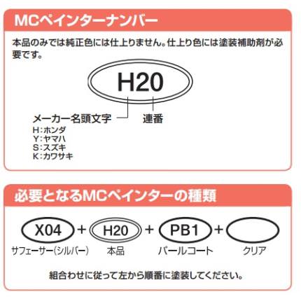 ・MCペインターはバイク専用のペイントスプレー・MCペインター1本で希望するカラーに仕上げるのは、ほとんどの場合ムリです。下塗り、塗り重ね、クリア等の上塗りが必要になります。(組み合わせをご確認ください。)・純正カラーコードは通常スクーターはメットインボックス内に貼り付けてあります。その他はシート下等のフレーム部に貼られています。・塗装の仕方・塗り方によって色の違いがあります。また車両の塗装焼け、くすみによって微妙な色の違いがあります。予めご了承ください。・仕上り色合い違い、作業不備による仕上りイメージの違い等の補償には応じられません。予めご了承ください。・主な適合車種:ZRX1100Ⅱ・ ZZ-R1100・ KLR650・ EX-4・ エリミネーター400LX・ ザンザス・ ZZ-R250・ エストレヤカスタム・ バリオス・ バリオスⅡ