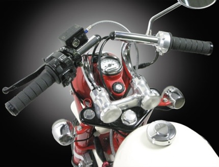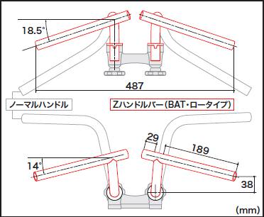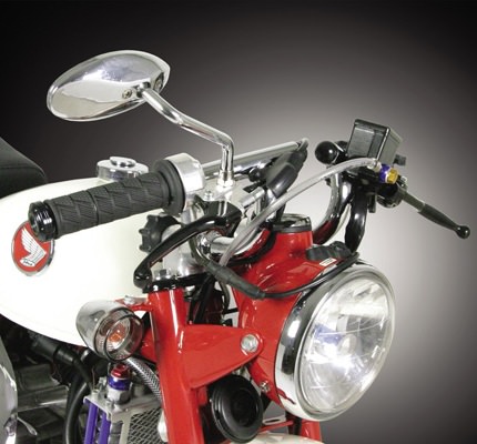 モンキーのキャラクターアイテムの一つであるハンドルホルダーノブを残したまま、ステアリングカスタムをお楽しみいただけるZハンドルバーシリーズに新たに、BAT・ロータイプが加わりました。ノーマルより低いハンドルポジションに加え、最適な絞り角と垂れ角を設定する事でスポーティーな前傾姿勢を演出します。全体の外観もコンパクトとなり、可愛らしさを強調します。武川製バックステップやTLシートを合わせて使用することで、さらに戦闘的なポジションとスタイルに出来ます。アルミ削り出しハンドルホルダーノブ(CZスタイル:06-02-0012 / Zスタイル:06-02-0013)デを同時装着することで、更にハンドル周りのドレスアップが行えます。6V 2.6ps モンキー(Z50J-1000001~1510400)に取付ける場合、ノーマルスロットル、クラッチレバーは使用出来ません。折りたたみ状態で保管する場合、ノーマルハンドル同様の角度まで折りたたむことは出来ません。各部干渉の無い範囲で調整して下さい。
