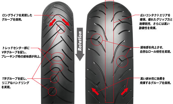 ツーリングタイヤに求められる摩耗ライフやウェット性能の飛躍的なレベルアップを実現。同時に優れた運動性能を備えた、進化したスポーツツーリングタイヤ。ロングツーリングをより快適に楽しみたいお客様へ、重量のあるスポーツツアラーからスポーツネイキッドに乗るお客様へにお勧めです。パタンおよびコンパウンドの最適な組み合わせにより、濡れた路面においても十分な接地感を得られ、安定したコーナーリングワークを可能にした。高速クルージングモードでは、路面μの変化によらず優れた安定性を発揮。ワインディングにおけるスポーツモードでは、優れたグリップやハンドリングを実現した。ロングツーリングにおいても快適なクルージングを可能にする、優れた衝撃吸収性と静粛性。その一方で、高速走行中に変化する路面コンディションを、的確にライダーに伝える優れた接地感を実現した。シリカリッチEX(フロント)・シリカリッチ(リア)とRCポリマー搭載のBT-023専用コンパウンドを新開発。ウェット性能と耐摩耗性の大幅な向上を可能にした。シリカリッチEX〈NEW〉:従来を越える高配合のシリカを搭載。ウェット性能の向上に高い効果を発揮する。