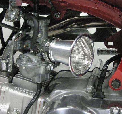 大口径ファンネルを採用したKEIHINPC18/PC20キャブレター専用エアファンネル。開口部にはステンレス製ネットを備え、吸気効率を損なわず砂利などの浸入を防ぎます。又、本製品はアルミ材を削り出すことで美しさと性能を兼ね備えています。オプショナルの専用エアフィルターを使用することで、防塵効果高めることが出来ます。