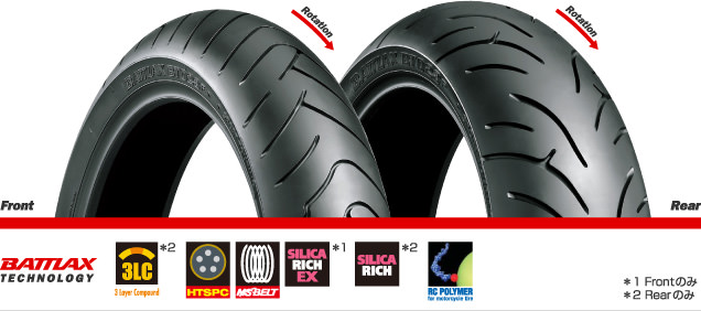 ツーリングタイヤに求められる摩耗ライフやウェット性能の飛躍的なレベルアップを実現。同時に優れた運動性能を備えた、進化したスポーツツーリングタイヤ。ロングツーリングをより快適に楽しみたいお客様へ、重量のあるスポーツツアラーからスポーツネイキッドに乗るお客様へにお勧めです。パタンおよびコンパウンドの最適な組み合わせにより、濡れた路面においても十分な接地感を得られ、安定したコーナーリングワークを可能にした。高速クルージングモードでは、路面μの変化によらず優れた安定性を発揮。ワインディングにおけるスポーツモードでは、優れたグリップやハンドリングを実現した。ロングツーリングにおいても快適なクルージングを可能にする、優れた衝撃吸収性と静粛性。その一方で、高速走行中に変化する路面コンディションを、的確にライダーに伝える優れた接地感を実現した。シリカリッチEX(フロント)・シリカリッチ(リア)とRCポリマー搭載のBT-023専用コンパウンドを新開発。ウェット性能と耐摩耗性の大幅な向上を可能にした。シリカリッチEX〈NEW〉:従来を越える高配合のシリカを搭載。ウェット性能の向上に高い効果を発揮する。