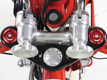 ※カラーを選択して下さい。モンキー・ゴリラのノーマルトップブリッジのドレスアップパーツです。イニシャルアジャスターをモチーフとしたデザインはカスタムイメージを高めます。アルミを精巧に削り出し、アルマイトを施すことでトップブリッジ周りを美しく演出します。ノーマルトップボルトと異なり、リテーナー部とキャップ部の色の組み合わせもお楽しみ頂けます。カラーはキャップとリテーナーが同色の4種類。締め付け用ボルトのネジ部は長さ30mm