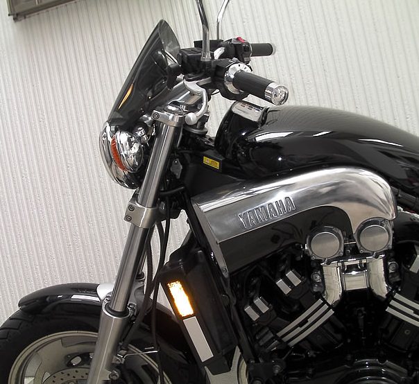 国産車の中でも、異彩を放っているV-MAXは、一度アクセルを回せば、圧倒的なパワーで加速していきますが、ネイキットとアメリカンの中間のような独特のデザインの車体には、カウル類が付いていない為、風との戦いになります。そこで開発したのが、v-max専用のメーターバイザーです。小さなメーターバイザーでも、つけているのと、いないのでは、圧倒的な違いがあり、未装着時よりも楽にアクセルを回して加速していくことが可能です。取り付けはv-max専用設計で、ウインカー部分に取り付けます。サイズ:横幅:250mm 縦幅265mm