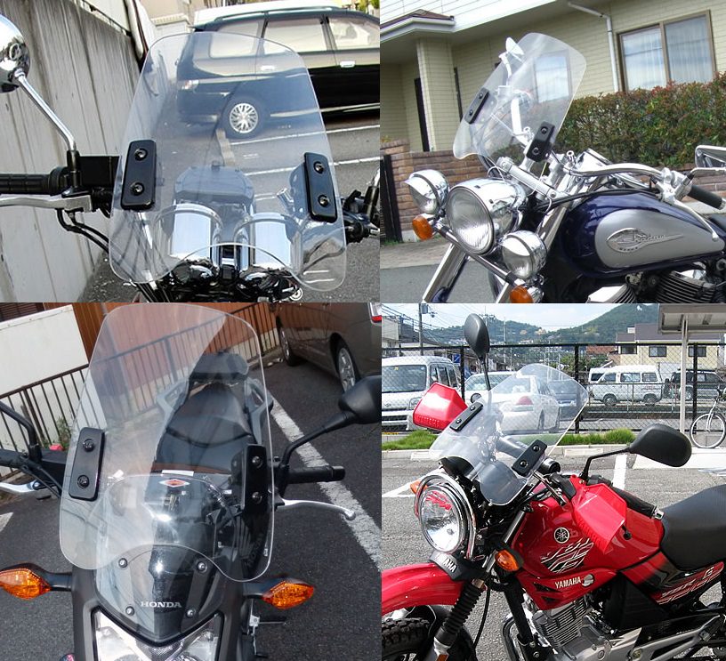 22.2~1インチのハンドル車両に幅広く装着可能です。大きすぎず、小さすぎない形状は、アメリカンタイプのバイクだけに限らず、原付から、ネイキット、クラシックタイプのバイクまで幅広くマッチします。専用の取り付けステーを採用することで、ハンドルの太さに限らず、取り付けることが可能です。の取り付けステーはスクリーンの角度をある程度変更することが出来ます。垂直に近く立てれば風防効果がアップしますが、風の抵抗を強く受けるために、加速が悪くなります。逆にライダー側に傾ければ、フロントタイヤを地面に押し付ける力が強くなり安定した走行が出来るようになります。お客様の中には、最高速が伸びた!燃費が良くなった気がする・・・などのお喜びの声も頂いております。ロボハン、フラットハンドル、チョッパーハンドルなど、ハンドル形状を選ばず、ほとんどのハンドル形状に対応しています。サイズ:縦:380mm 横:310mm 厚さ:5mm取付実績車種:ホンダcb400ss・ホーネット・ftr223・シャドウエアロ・シャドウスラッシャー・シャドウ400・シャドウ750・スティード600・マグナ50・マグナ250・スティード400・gb250 クラブマン・ジョーカー・レブル・エイプ100・NC700・vt750s・vt400s・xr250・CL400・xk125 パリダカール・nv400ヤマハv-max・ybr125g・ドラッグスター250・ドラッグスター400・ドラッグスター400 クラシック・ドラッグスター1100・ビラーゴ250・ビラーゴ1100・wr250・xjr1200・tw225・トリッカー・xt250x・xs750スズキst250e・gn125・グラストラッカービッグボーイ・ボルティー・gz125hs・gn125h・バンバン・デスペラード・テンプターカワサキdトラッカー・kle250 アネーロ・zr-7・z400ltd・w650・バルカン900 クラシック・バルカン400・スーパーシェルパ・ゼファー1100ハーレーダビットソンソフテイル クロスボーンズ・ヘリテイジ ソフテイル クラシック・ダイナ ストリートボブ・ダイナ ローライダー・ナイトロッド・スポーツスター ロー・フォーティーエイト・スポーツスタースポーツ・xr1200・ソフテイルスタンダード・ナイトトレイン・xl883r・xl883上記の車種全てボルトオンで取り付け出来る事を証明するものではございません。取り付けの際加工が必要になる車種もございますのでご理解の上ご購入くださいませ。