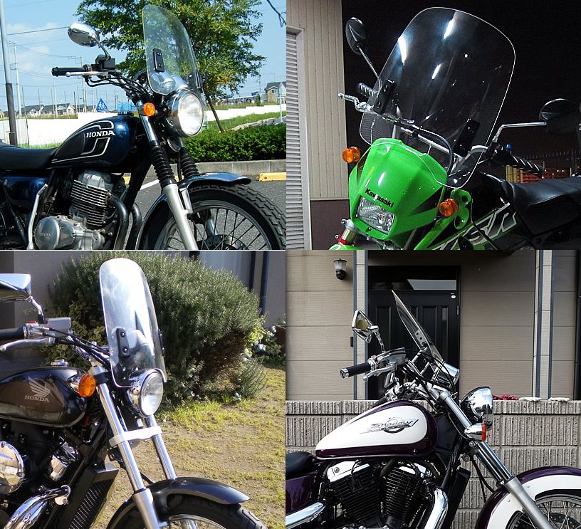 ウインドスクリーンはWS-02Wのデザインを踏襲しつつ、更に大き目のウインドスクリーンを制作いたしました。実際に取り付けて乗ってみると、WS-02Wがたては首から下、横は肩口ぐらいまでの風を防いでくれるのに対してWS-03Lは体全体をカバーしてくれるようなイメージです。取り付けのステーはWS-02Wから引き続き、フレキシブルステーを採用。ハンドルは1インチまでの太さに対応し、どのようなハンドル形状にも取り付けることが可能です。取付実績車種:ハーレーダビッドソンダイナ ローライダー・ファットボーイロー・FLSTN・fxd・スプリンガー ソフテイル・xl883n スポーツスター アイアン・xl1200s スポーツスター スポーツ・スーパーグライドカスタム・ファットボーイ・ダイナ ストリートボブホンダcb400ss・v45 マグナ・vf マグナ・マグナ250・cd125t ベンリー・xr230・スーパーカブ110・cb400sf・vfr400・シャドークラシック400・マグナ50・シャドウファントム・v twin magna マグナ250・・・ヤマハxjr1200・ドラッグスター400・ドラッグスター400クラシック・xv1900a ミッドナイトスター・ビラーゴ250・ybr125スズキイントルーダー・イントルーダー250・イントルーダー400クラシック・ジェベル200・ビラーゴ250・ボルティーカワサキksr110・w800・バルカンドリフター 400・エリミネーター125その他モトグッチ カリフォルニア3・トライアンフ アドベンチャー上記の車種全てボルトオンで取り付け出来る事を証明するものではございません。取り付けの際加工が必要になる車種もございますのでご理解の上ご購入くださいませ。