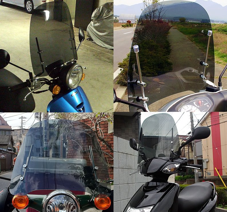 ※ミラーのネジがハンドルカウルより5mm以上低い場合及びFブレーキのサブタンクがミラー基部より約1cm以上高い場合は、ミラーアダプターが必要です。ご要望の多かった原付用のウインドスクリーンをリリースいたしました。風や雨を防ぐのはもちろんですが、虫のアタックから身を守ることが出来ます。シールドが無いタイプのヘルメット装着時に、メガネやサングラスをかけているにも関わらず、小虫が目に入って苦しい思いをしたことがある方は多いはずです。走行中のアクシデントを防ぎ、風が体に当たることによる疲労度を軽減してくれます。取り付けはバックミラーのネジ部分を利用して取り付けます。また付属のステーは、左右のミラーの取り付けネジの中心間距離が300~440mmまで取り付け可能です。また横だけでなく、上下にもスライドさせることが可能で、約700mmの範囲でスライドさせることが可能です。サイズ:横幅:450mm 縦幅:380mm取付実績車種:dio【ディオ】・today【トゥディ】・vino【ビーノ】・vino125【ビーノ125】・アドレスv50・アドレスv100・アドレスv110・アドレスv125・ヴェクスター125・ヴェルデ・クリック・シグナスX・ジャイロアップ・ジョグ・スペイシー100・モトラ・モンキー・リード50・リード90・レッツ2・レッツ4・レッツ5・ロンシン・アドレスv125・ベクスター125・ヴェクスター150・カブ110・シグナスX・ジャイロアップ上記の車種全てボルトオンで取り付け出来る事を証明するものではございません。取り付けの際加工が必要になる車種もございますのでご理解の上ご購入くださいませ。