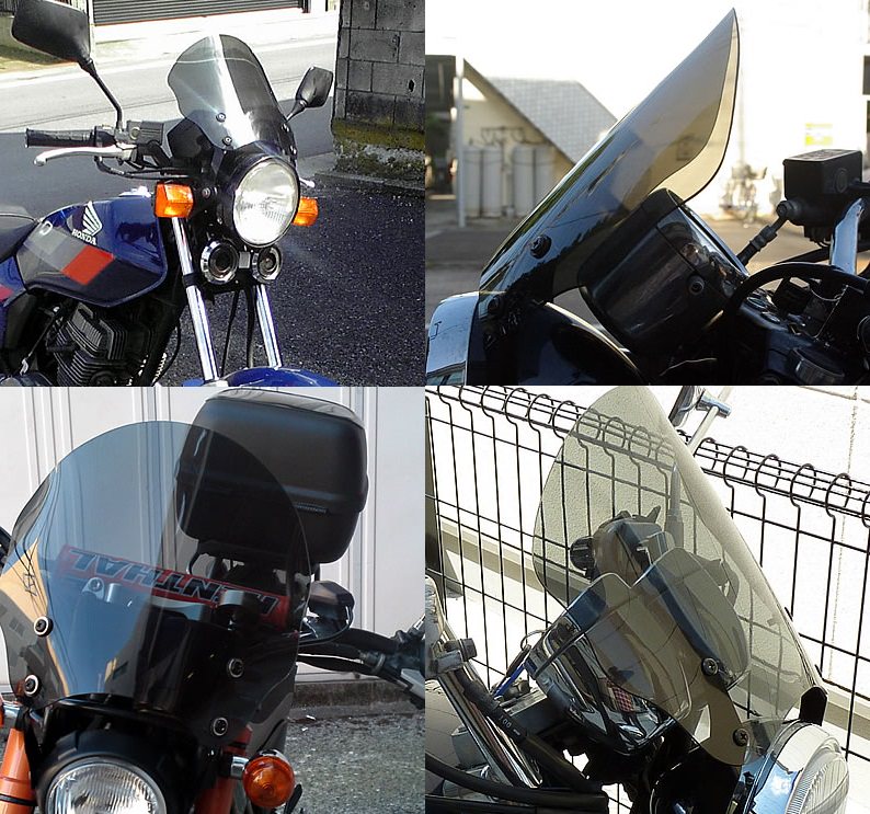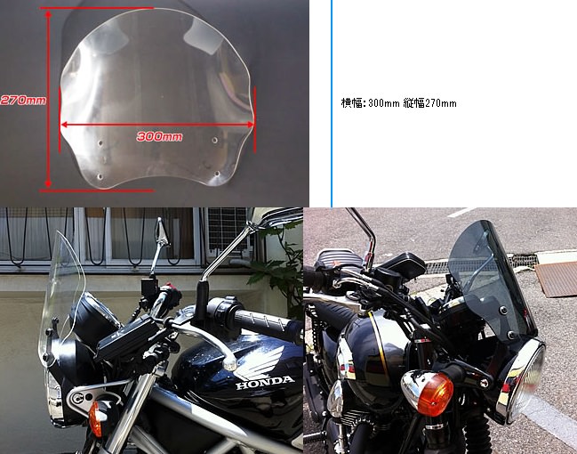 大き目のメーターバイザーが欲しいというご要望にお答えして、開発したのが、WS-05Mです。ビキニカウルと同程度の風防効果を備えたメーターバイザーです。スタイル的にビキニカウルはちょっと・・・でも風防効果は欲しい・・・という方にはまさにピッタリの商品です。WS-01Mに比べて、横幅で70mm 縦幅で30mm大きくなっています。数値にすると、わずかな違いに感じられるかもしれませんが、実際装着して走行してみると、大きな違いを感じることが出来ます。テストライダーの体感ですと、前からの風が急激に軽減され、顎から下に風が当たりにくくなるというテスト結果が出ています。肩口から上に風が逃げていくようなイメージです。本品サイズ:横幅:300mm 縦幅270mm取付実績車種:ボルティー・cb125t・cb400ss・st250・vtr250・w650・ゼファー1100・gn125・sr400・xjr1300・エストレア250・cb1000sf・r1-z・srv250・cb50・cb223s・cb750・トリッカー・tw225・vrx400・ゼファー750・ホーネット250上記の車種全てボルトオンで取り付け出来る事を証明するものではございません。取り付けの際加工が必要になる車種もございますのでご理解の上ご購入くださいませ。