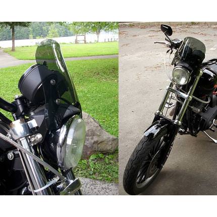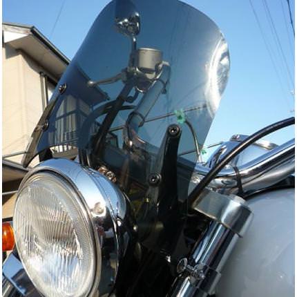 フロントフォークの径が38φ~42φの車両に取り付け可能です。このフロントフォークの系は国産だと、ドラッグスター400やスティード、輸入車だとハーレ スポーツスターやダイナなど、アメリカンに多いサイズです。アメリカンバイクは基本的に乗車姿勢が直立な物が多く、風の抵抗を体にもろに受けるものばかりです。結果的にマシンのスペック的には優れていても、体に受ける風の抵抗が強く、アクセルを開け切れないという人が多くいます。本当に小さなスクリーンですが、このスクリーンをつけたお客様は皆さん一様に・・・こんなに小さいのに風防効果が抜群です!今まで80キロぐらいだと思っていた感覚でいると、100キロぐらい出ています!前よりアクセルを開けられるようになりました!とおっしゃいます。セット内容:1:WS-01M【スクリーン+取り付け金具】2:ウインカー取り付けバンド【フロントフォーク径 38φ~42φ】取付実績車種:FXD ダイナ・スティード400・マグナ・fxdl ダイナ ローライダー・ドラッグスター400・fxdx ダイナ スーパーグライド スポーツ上記の車種全てボルトオンで取り付け出来る事を証明するものではございません。取り付けの際加工が必要になる車種もございますのでご理解の上ご購入くださいませ。