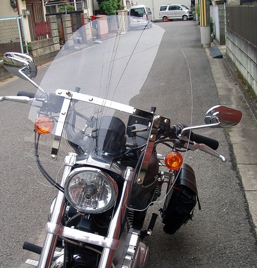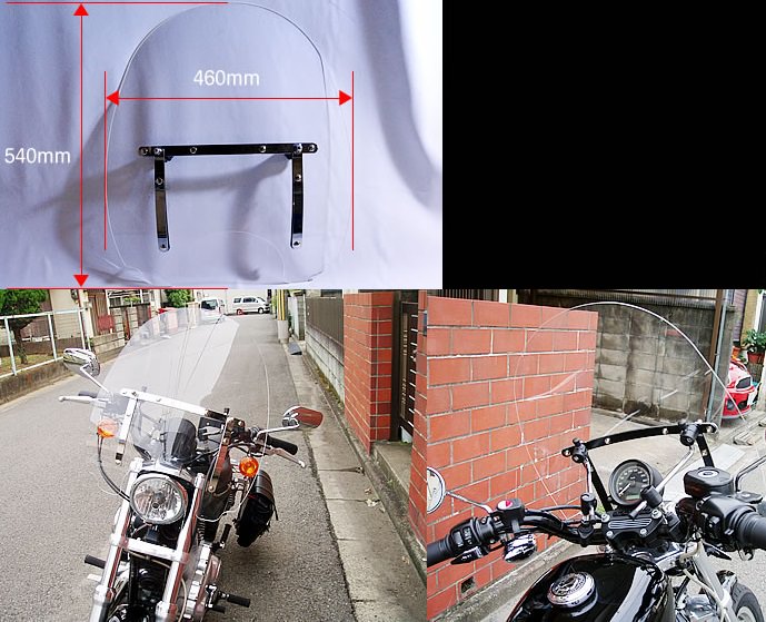 サイズは縦540ミリ、横460ミリに設定しています。ワールドウォークの既存のウインドスクリーンは、デザインとサイズのバランスを優先して開発を進めていましたが、こちらはまずはサイズと風防効果を優先し、デザインは後から調整しました。ヘッドライトが収まるようにスクリーン下部にえぐりが入っていますが、ヘッドライトの径が210φまで適合します。今までのスクリーンに比べてかなり大型のスクリーンのため、ツーリングや通勤時の疲労軽減に貢献します。適合車種1インチまでのハンドル装着車両