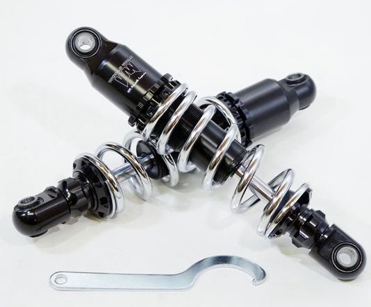車高調整機能【320mm~295mm】プリロード調整機能【無段階調整機能】減衰力調整機能【27段階調整】車高調整機能:305mm 1Gで293mm 乗車1Gで290mm※1Gとはサスペンションを車両に取り付けた状態のサスペンションの長さ、乗車1Gとは、サスペンションを車両に取り付け、1名乗車した時の長さです。今回は65キロの人間が座った時の長さです。プリロード調整機能:2mm減衰力調整機能:最弱状態から8クリック以上のメーカー推奨セッティングでお送り致します。セッティングをいじりたいときは、まず動きの変化を確かめるために、一番最弱の状態と、一番最強の状態を確かめてみて、少しずつ調整をしてみてください。スポーツスター用 アジャスタブルサスペンションはコイル幅が一定ではないプログレッシブタイプ【不等ピッチ】のスプリングを採用いたしました。プログレッシブタイプのスプリングを採用したことで、車体にかかる、初期の荷重の負荷をコイル幅の狭い部分を受け止めコイル幅の広い部分で、大きな負荷を受け止めています。通常のスプリング形状と比べると、「バイクに乗車した時のサスペンションの沈み込みの量が変わる」「減速帯などの細かい段差のショックを緩和し、ライダーへの突き上げ感を軽減する」など、乗り心地が良くなり、スムーズな動きになります。■ショックアブソーバー本体はアルミを採用ショックアブソーバーのボディーはアルミを採用いたしました。XL1200Rなどに使われている純正サイズ(335mm)のサスペンションは3.58kgの所、ワールドウォークのスポーツスター用アジャスタブルサスペンションは2.79kgですので、およそ800g程度の差があります。高品質なブラックアルマイト仕上げです。■長距離走行でも性能を落とさない、フリーピストンを装着ショックアブソーバーの中には、窒素ガスが充填されているガス室と、サスペンションオイルが充填されているオイル室があります。ガス室と、オイル室を隔てているのがフリーピストンです。サスペンション用のオイルは空気と混ざりにくく、泡立ちにくいという特性がありますが、オイルが劣化していたり、長距離走行すると、空気と混ざり気泡ができてしまう事があります。気泡ができると、オイルが本来の性能を失い、サスペンションの挙動に大きく影響します。フリーピストンを採用しオイル室とガス室を隔てることで、オイルと空気が混ざることを防ぎ、長距離の走行でも安定した性能を維持出来るようになっています。■フルオーバーホールに対応スポーツスター用アジャスタブルサスペンションはフルオーバーホール可能です。サスペンションを長く使っていれば、中に入っているオイルの劣化、窒素ガスの抜けなど本来の性能が発揮できなくなっていきます。また、ショックアブソーバーの中で、減衰を制御しているバネ鋼のシムも徐々に劣化していきます。オイルの交換は出来れば1万~1万2千km程度で行ったほうが良いのですが、・サスペンションが底づきしているような気がする・タイヤの設置感がない・車高が下がっているような気がするといったような気がする場合には、ワールドウォークでのオーバーホールが可能です。※サスペンションはバイクの動きを決める、とても大切なパーツです。もしも取りつけ方を間違ってしまったり、ボルトの締め付けが足りなかった場合、事故に繋がることもありますので、認証工場のプロの整備士にお願いしてください。※サスペンションのセッティング・車両の状況に応じてベルトの調整を行って下さい。