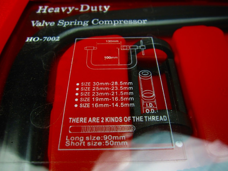 主にバイク、軽自動車のバルブのスプリングやシールが交換できるツールセット交換可能なアタッチメントが5種類付属しており、各種サイズに対応セット内容クランプ能力 130mm奥行きサイズ 100mmアタッチメント 30-28.5、25-23.5、23-21.5、19-16.5、16-14.5mmエクステンションボルト ロング90mm、ショート50mmカムチェーンにご使用の際は、本体にアンビル(ロアーガイド)を取り付け、アライメントボルトにはアッパーガイドを取り付け、2.2mmピンを使用します。