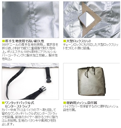 付属品:収納用袋300デニールの厚手生地で耐久性抜群車種別に設計したビッグスクーター専用でしかもリアボックス付きに対応するバイクカバーです。300デニールの厚手生地使用で耐久性と撥水性を高めました。様々なロックに対応する大型ロックスリットを装備。また風飛び・バタツキ防止用ワンタッチバックル式センターストラップを装備。収納に便利なメッシュ袋が付属します。MXBサイズフュージョン・マグザムGMBサイズシルバーウィング・グランドマジェスティ・スカイウェイブ等