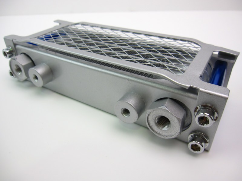 プロテクトオイルクーラーは4Miniバイクに適したサイズ。ハードな使用に耐えうる、金属性プロテクターを正面に配備しています。汎用性の高いM10(P1.25)バンジョーが使用できます。サイズW200×H70(mm)※取り出し口を除いた寸法。