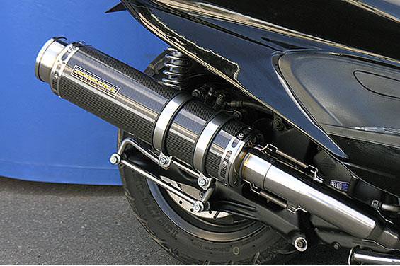 ■受注生産商品となっており、商品手配後 2週間程度入荷にお時間を頂きます。■大柄なビッグスクーターの車体にマッチするよう、極太のエキパイ60mm径、サイレンサー110mm径という仕様で、バランスのとれた仕上がりなっています。ブラックカーボンタイプはステンレスサイレンサーにカーボンシートを巻いた仕様で、耐久性が抜群に高い構造を採用しています。排気口はステンレス削りだし部材を採用し無骨で迫力のある「BSタイプ」です。サイレンサーバンドにはスリットタイプを採用してデザインにもこだわっています。サイレンサーの固定にはサイレンサーバンドを採用し、バフ仕上げを施したステンレス製丸棒で組んだステーを介して固定しておりますので、従来のステーの固定より車体と調和した高級感あふれるマフラーです。オールステンレス製で、エキパイからサイレンサーまでバフ仕上げを施しています。低中速を落とすことなく高回転でスムーズに回り扱いやすい設定になっています。振動防止のためサイレンサーとエキパイが2分割となる安心設計になっています。サイレンサーは、3点止めになっていますのでしっかりと固定でき、耐久性にも優れています。無加工ボルトオンにて装着できますので、必要な工具があれば簡単に取り付けできます。(取り付けに必要なボルト類は全て付属しております。)サイレンサーはストレート構造ではなくフロント部にパンチングを施した作りになっていますので、音量は静かめに抑えられており近所迷惑になる事無く安心して走行できます。ローダウンにも対応しておりますので、安心してご使用下さい。バッフル装着時 約89db(法定規制値内音量)バッフル非装着時 約92dbになります。