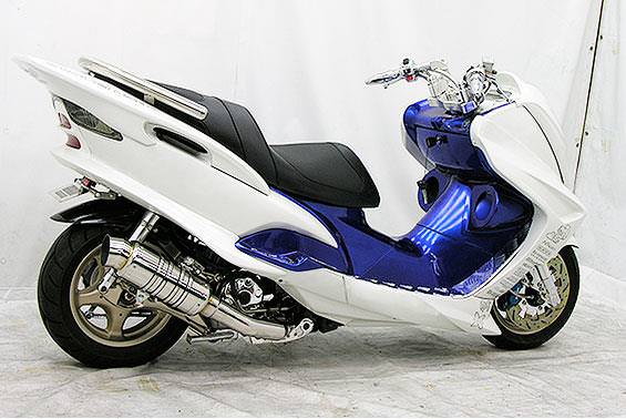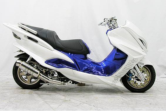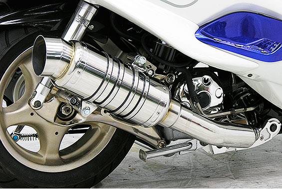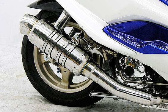 ■受注生産商品となっており、商品手配後 2週間程度入荷にお時間を頂きます。■浅倉商事が自信を持ってお届けする、極限まで価格を抑えた次世代の新定番マフラーです。オールステンレス製でエキパイからサイレンサーまでバフ仕上げを施しています。ビッグスクーターにマッチするよう極太のエキパイ60mm径、サイレンサー110mm径の仕様で、非常にバランスのとれた仕上がりなっています。性能面は、低中速を落とすことなく高回転でスムーズに回り扱いやすい設定になっています。サイレンサーは、ストレート構造ではなくフロント部にパンチングを施した作りになっていますので音量は、静かめに押さえられ近所迷惑になる事無く安心して走行できます。音質も耳障りな音でなくバッフル装着時は静かめの低音、バッフル非装着時は心地よい最高の重低音を実現しております。無加工ボルトオンにて装着できますので、必要な工具があれば簡単に取り付けできます。(取り付けに必要なボルト類は全て付属しております。)振動防止のためサイレンサーとエキパイが2分割になる安心設計になっており、耐久性が抜群に高い構造を採用しています。サイレンサーの固定にはサイレンサーバンドを採用し、バフ仕上げを施したステンレス製丸棒で組んだステーを介して固定しておりますので、従来のステーの固定より車体と調和した高級感あふれるマフラーです。ローダウンにも対応しておりますので、安心してご使用下さい。排気音量はバッフル装着時 約88db(法定規制値内音量)バッフル非装着時 約91db になります。